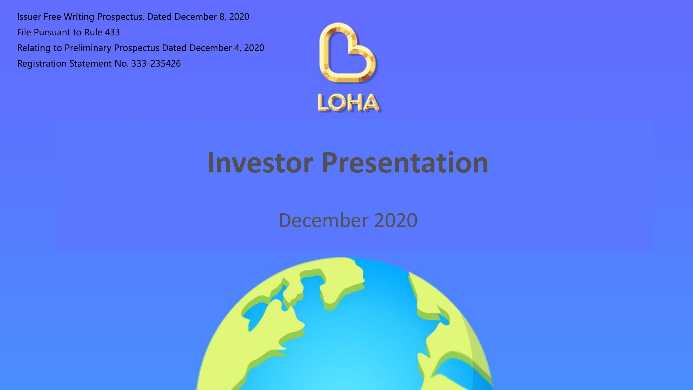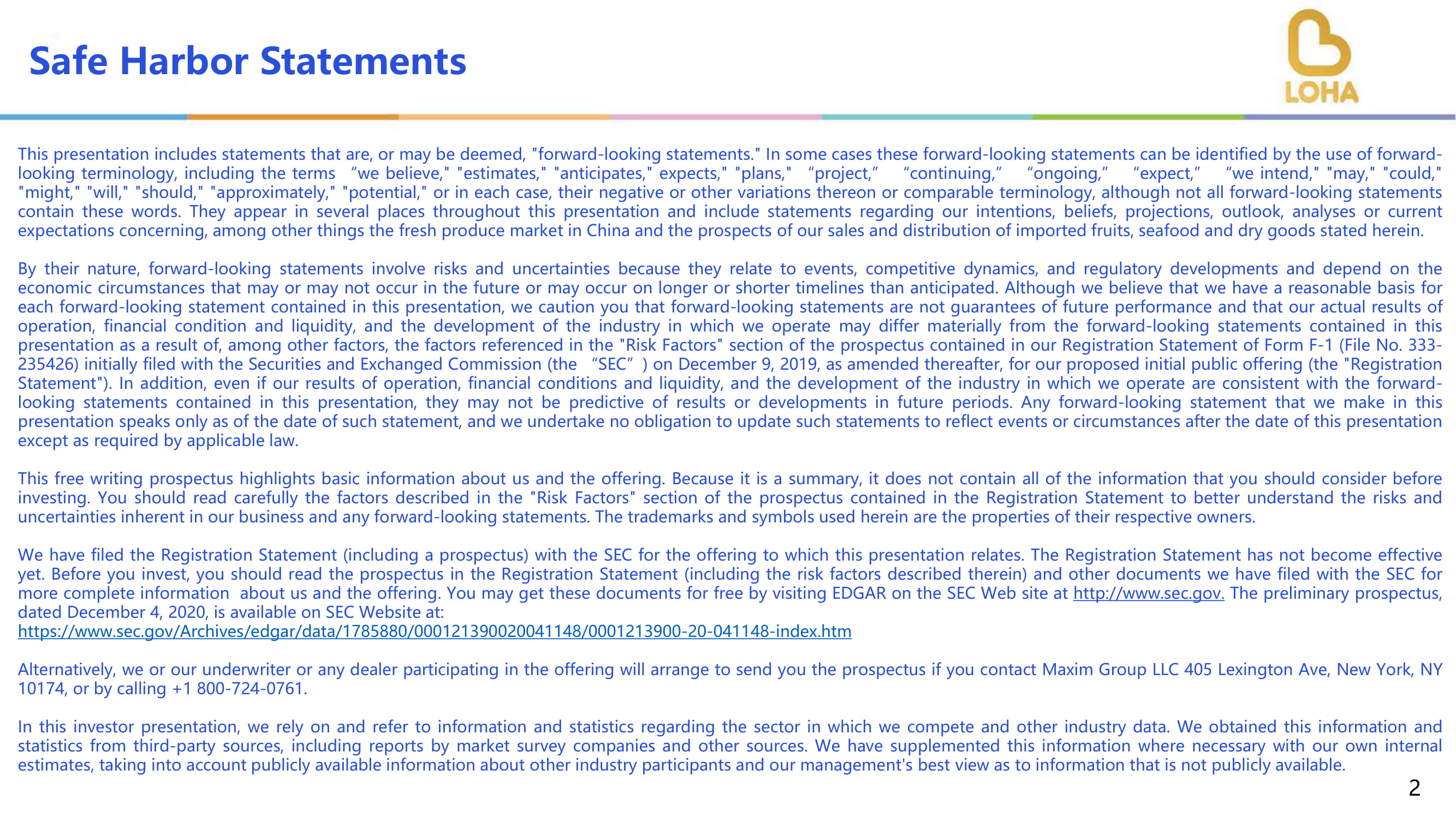 安全港陈述这种陈述包括属于或可能被认为是“前瞻性陈述”的陈述。在某些情况下,这些前瞻性陈述可以通过使用前瞻性术语来识别,包括术语“我们相信”、“估计”、“预期”、“预期”、“计划”、“项目”、“继续”、“进行中”、“预期”、“我们打算”、“可能”、“可能”、“可能”、“将要”、“应该”、“大约”、“潜在”,或在每种情况下,它们的负面或其他变化或可比术语,尽管并非所有前瞻性陈述都包含这些词语。它们在整个演讲中出现在几个地方,包括有关我们的意图、信念、预测、展望、分析或当前预期的陈述,其中包括有关中国生鲜产品市场以及本文所述进口水果、海鲜和干货销售和分销前景的陈述。就其性质而言,前瞻性陈述涉及风险和不确定性,因为它们涉及事件、竞争动态和监管动态,取决于未来可能发生或可能不发生的经济情况,或可能发生在比预期更长或更短的时限内。虽然我们认为本陈述中的每一项前瞻性陈述都有合理的依据,但我们提醒您,前瞻性陈述并不能保证未来的业绩,我们的实际运营结果、财务状况和流动性以及我们所处行业的发展情况可能与本陈述中所载的前瞻性陈述有很大不同,原因之一是,我们在F-1表格(档案编号:F1)的注册声明中,在招股章程的“风险因素”一栏所提及的因素。333-235426)最初于2019年12月9日向美国证券交易委员会(“SEC”)提交了关于我们拟进行的首次公开发行(“注册声明”)的文件,后经修订。此外,即使我们的运营结果、财务状况和流动性,以及我们所处行业的发展情况与本次列报中包含的前瞻性陈述相一致,它们也可能无法预测未来时期的结果或发展。我们在本陈述中所作的任何前瞻性陈述仅涉及此类陈述之日,我们没有义务更新此类陈述,以反映本陈述之日之后的事件或情况,除非适用法律另有要求。这份免费撰写的招股说明书重点介绍了我们的基本情况和我们的产品。因为它是一个摘要,所以它并不包含您在投资前应该考虑的所有信息。阁下应仔细阅读注册声明所载招股章程“风险因素”一节所描述的因素,以更好地了解我们业务及任何前瞻性陈述所固有的风险及不明朗因素。这里使用的商标和符号是它们各自所有者的财产。我们已经就本演示文稿所涉及的发行向证券交易委员会提交了注册声明(包括招股说明书)。登记声明尚未生效。在您进行投资之前,您应该阅读注册声明中的招股说明书(包括其中描述的风险因素)以及我们向SEC提交的其他文件,以获得有关我们和此次发行的更完整信息。你可以在证券交易委员会的网站http://www.edgar.com上免费获得这些文件。sec。县治戈夫。初步招股说明书,日期为2020年12月4日,可在SEC网站查阅:https://www.org。sec。gov/archives/edgar/data/1785880/00121390020041148/000121390-20-041148-index。HTM另外,如果您联系纽约莱克星顿大道405号Maxim Group LLC,NY10174,或致电+1800-724-0761,我们或我们的承销商或任何参与此次发行的交易商将安排向您发送招股说明书。在本次投资者介绍中,我们依赖并参考了与我们竞争的行业有关的信息和统计数据以及其他行业数据。我们从第三方渠道获得了这些信息和统计数据,包括市场调查公司和其他来源的报告。我们考虑到其他行业参与者的公开信息以及管理层对不公开信息的最佳看法,在必要时用我们自己的内部估计数补充了这一信息。2