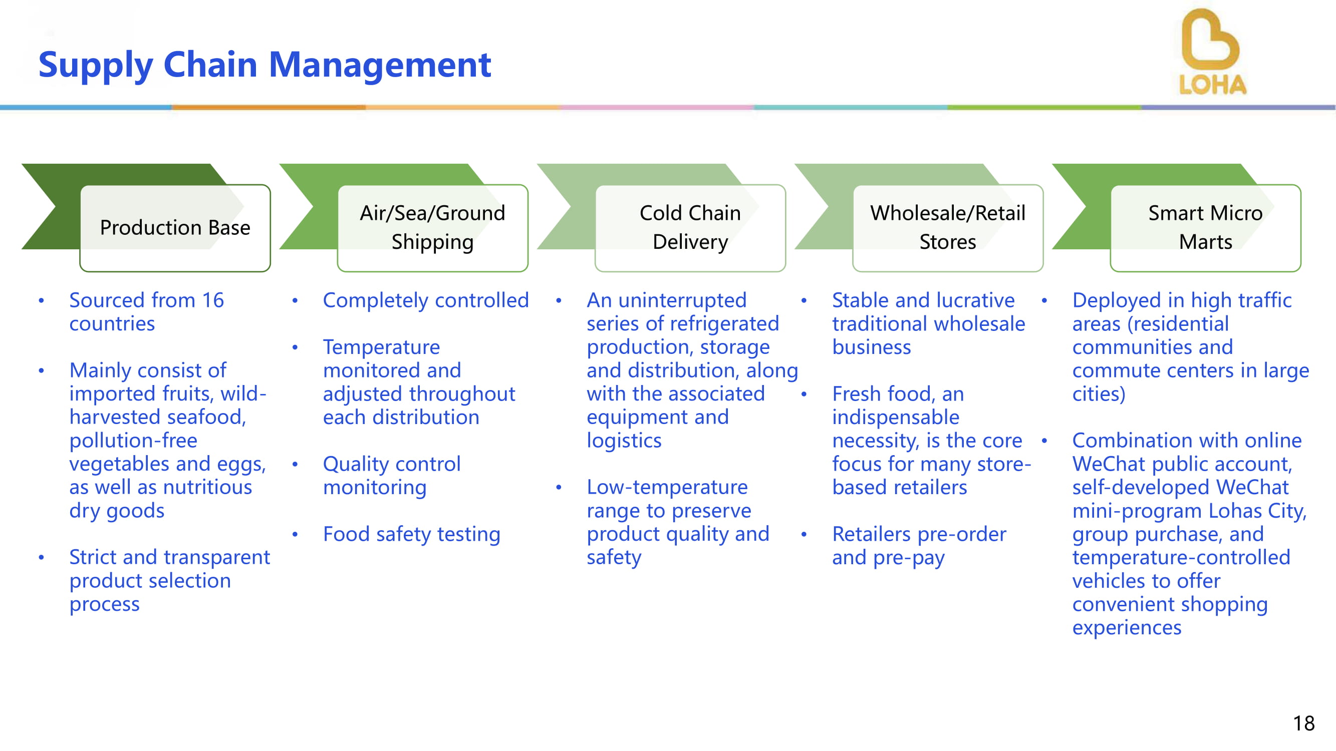 供应链管理生产基地海/海/地运输冷链配送批发/零售门店智能微集市全程监控温度调节!品控监控!食品安全检测!不间断的冷藏生产、储存、配送系列,连同相关联的设备和物流!低温范围,保持产品质量安全!稳定、利润丰厚的传统批发业务!生鲜,不可或缺的必需品,是众多门店零售商布局在高流量区域(大城市的居住社区和通勤中心)的预购和预付费!结合线上微信公众号、自主研发的微信小程序乐活城、团购、温控车等提供便捷购物体验的核心重点!源于16个国家,主要由进口水果、野生采收海鲜、无公害蔬菜和鸡蛋,以及营养干货!严格透明的产品选择过程18。