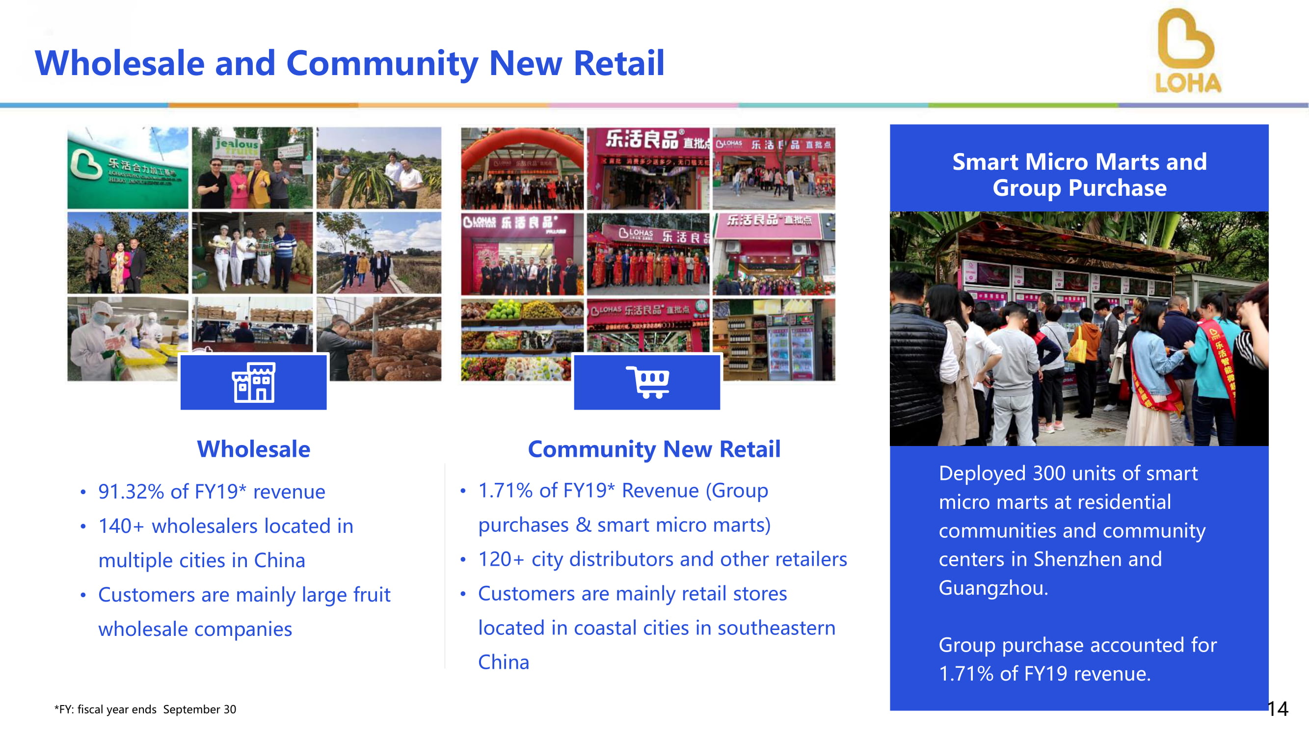 占FY19*收入的91.32%*位于中国多个城市的140+批发商客户主要为大型水果批发公司批发!占FY19*收入的1.71%*(团购&智能微集市)120+城市分销商及其他零售商客户主要为位于中国东南部沿海城市的零售商店社区新零售智能微集市及在深圳及广州的住宅社区及社区中心部署30台智能微集市的团购。团购占FY19营收1.71%。批发和社区新零售14*FY:财年截至9月30日