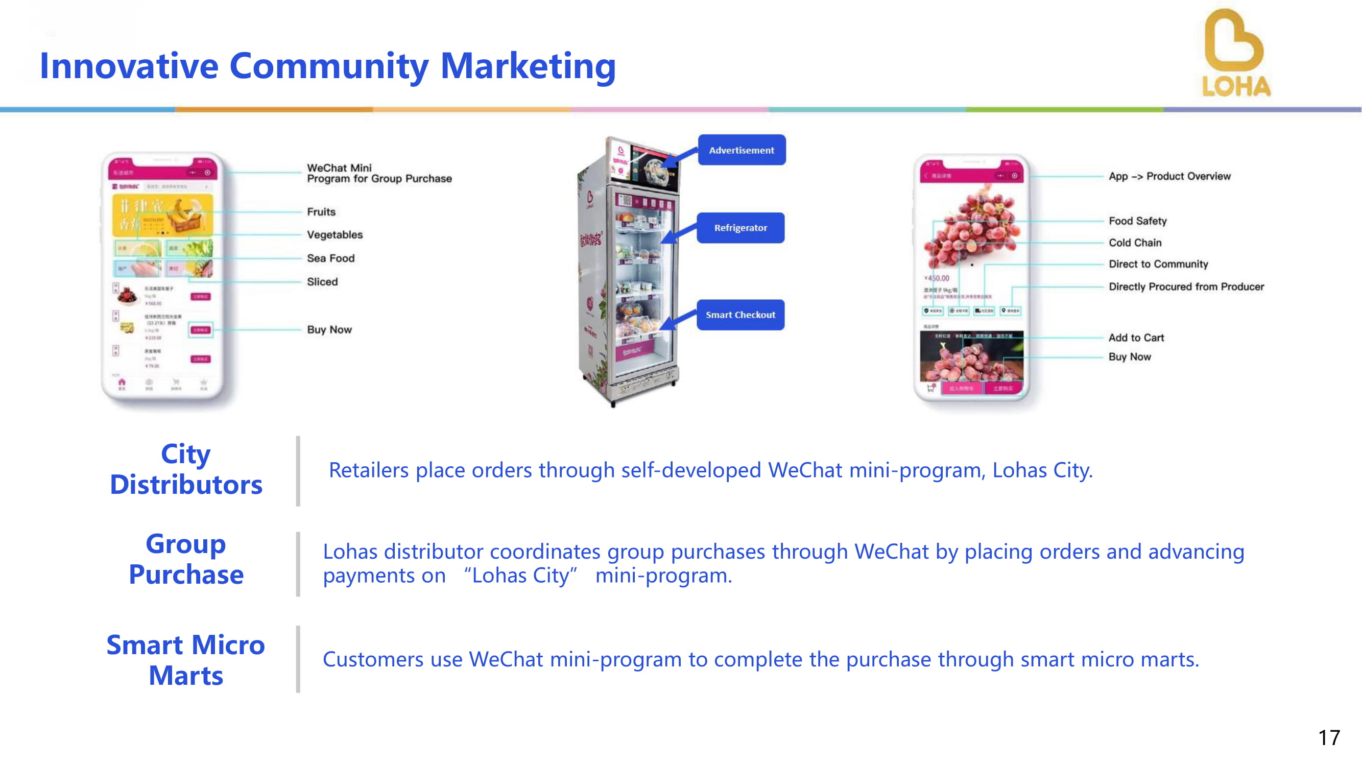 创新社区营销零售商通过自主研发的微信小程序乐活城下单。城市配送商乐活城配送商通过微信协调团购,在“乐活城”小程序下单、垫付货款。团购客户使用微信小程序,通过智能微集市完成购买。smartmicromarts17