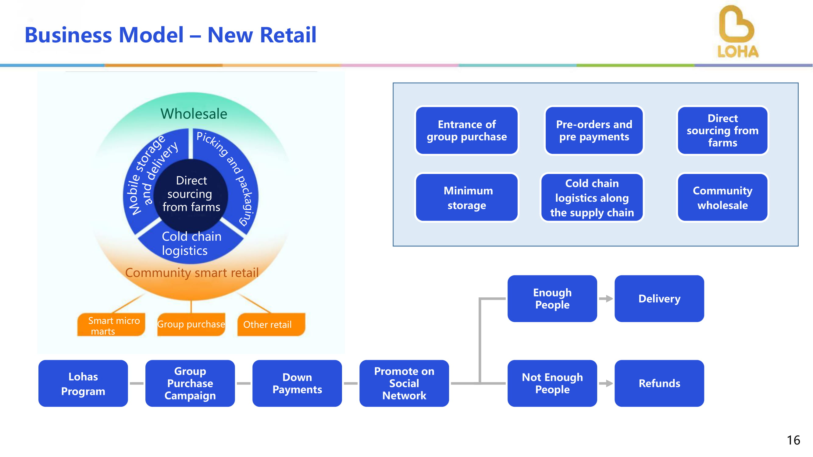 商业模式--2018年底推出的新零售退款乐活计划团购活动首付在社交网络上推广人数不够送够人E团购的恍惚P再下单和预付费从农场直接采购Inimum仓储沿供应链的旧链物流Ommunit和批发Holesale全城智慧零售S玛特微集市团购Other零售旧链物流Irect采购来自农场16