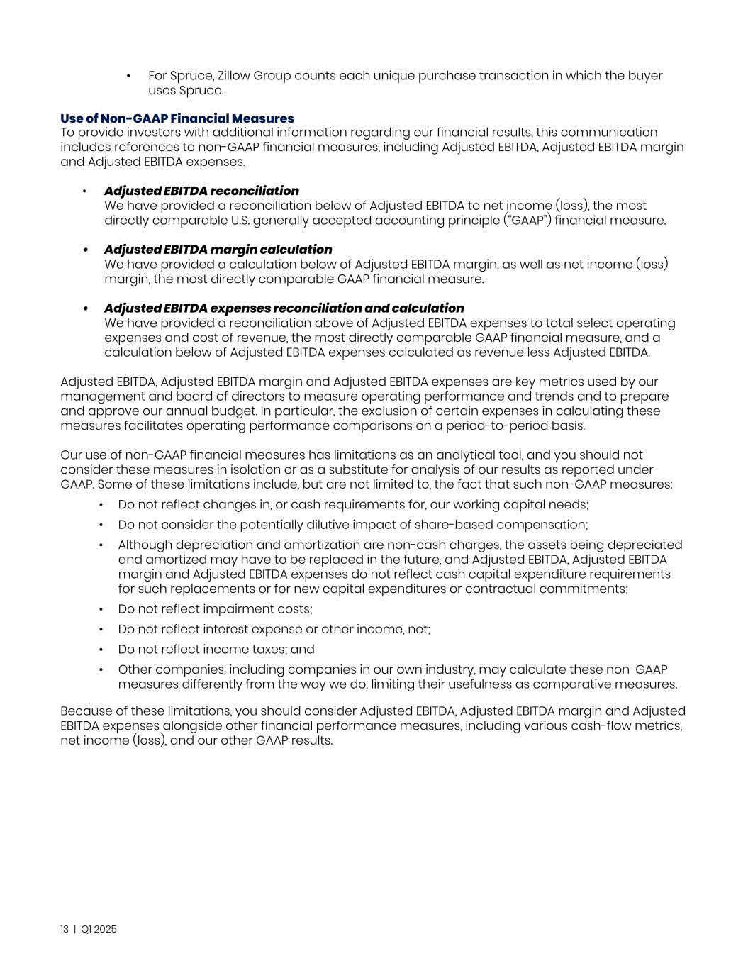 •对于云杉,Zillow Group会统计买方使用云杉的每笔独特的购买交易。使用非公认会计准则财务指标向投资者提供有关我们财务业绩的更多信息,本通讯包括对非公认会计准则财务指标的引用,包括调整后EBITDA、调整后EBITDA利润率和调整后EBITDA费用。•调整后EBITDA对账我们在下面提供了调整后EBITDA与净收入(亏损)的对账,这是最直接可比的美国公认会计原则(“GAAP”)财务指标。•调整后EBITDA利润率计算我们在下面提供了调整后EBITDA利润率的计算,以及净收入(亏损)利润率,这是最直接可比的GAAP财务指标。•调整后EBITDA费用对账和计算我们提供了调整后EBITDA费用与总选定运营费用和收入成本的对账,这是最直接可比的GAAP财务指标,以及以下计算的调整后EBITDA费用,计算方式为收入减去调整后EBITDA。调整后的EBITDA、调整后的EBITDA利润率和调整后的EBITDA费用是我们的管理层和董事会用来衡量经营业绩和趋势以及编制和批准我们的年度预算的关键指标。特别是,在计算这些计量时不包括某些费用,有助于按期间进行经营业绩比较。我们使用非GAAP财务指标作为分析工具存在局限性,您不应孤立地考虑这些指标或替代根据GAAP报告的对我们结果的分析。其中一些限制包括但不限于此类非公认会计原则措施:•不反映我们营运资金需求的变化或现金需求;•不考虑以股份为基础的薪酬的潜在稀释影响;•虽然折旧和摊销是非现金费用,但正在折旧和摊销的资产可能不得不在未来进行更换,调整后的EBITDA,调整后EBITDA利润率和调整后EBITDA费用不反映此类置换或新资本支出或合同承诺的现金资本支出需求;•不反映减值成本;•不反映利息支出或其他收入净额;•不反映所得税;•其他公司,包括我们自己行业的公司,可能会以与我们不同的方式计算这些非公认会计原则衡量标准,从而限制了它们作为比较衡量标准的有用性。由于这些限制,您应该考虑调整后的EBITDA、调整后的EBITDA利润率和调整后的EBITDA费用以及其他财务业绩指标,包括各种现金流指标、净收入(亏损)和我们的其他GAAP结果。13 | 2025年第一季度