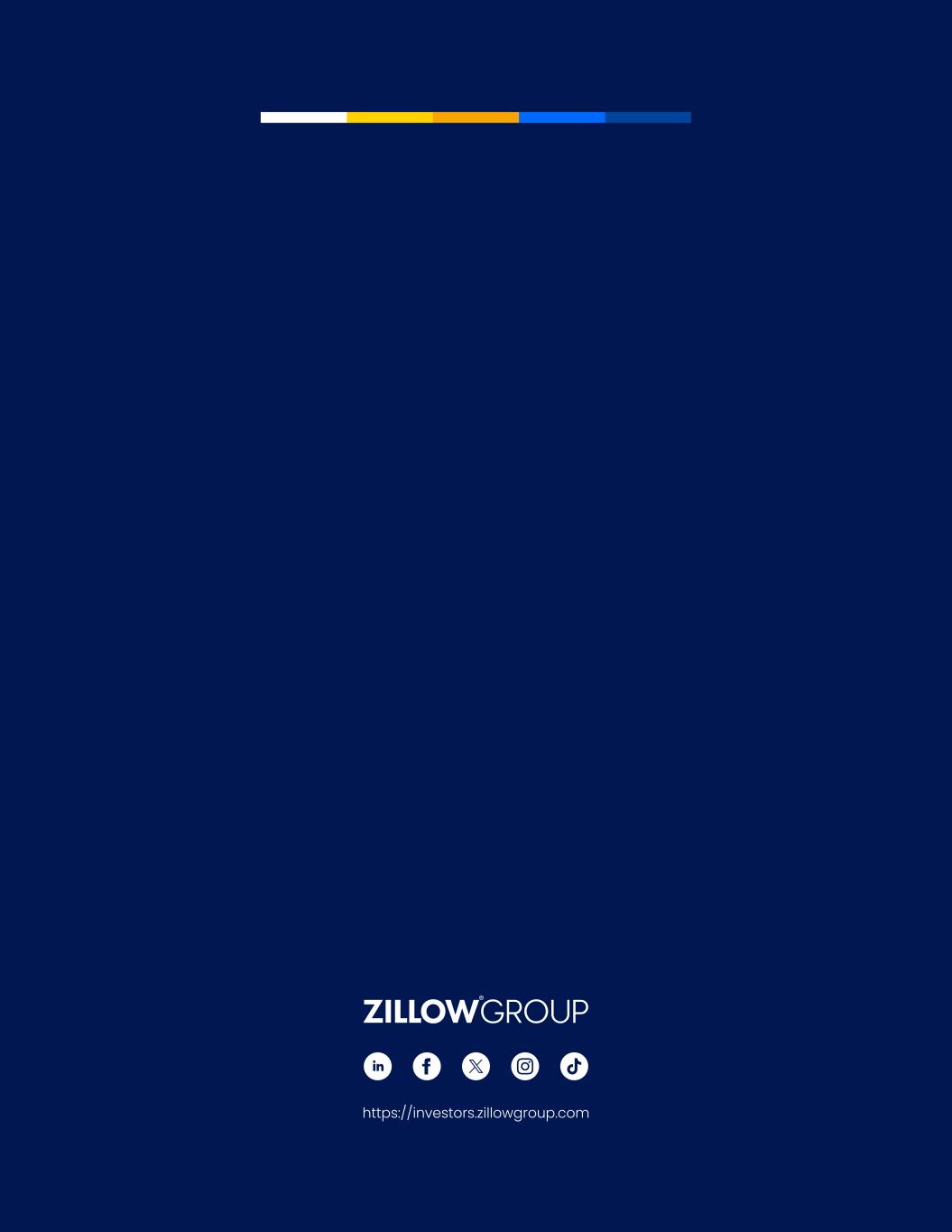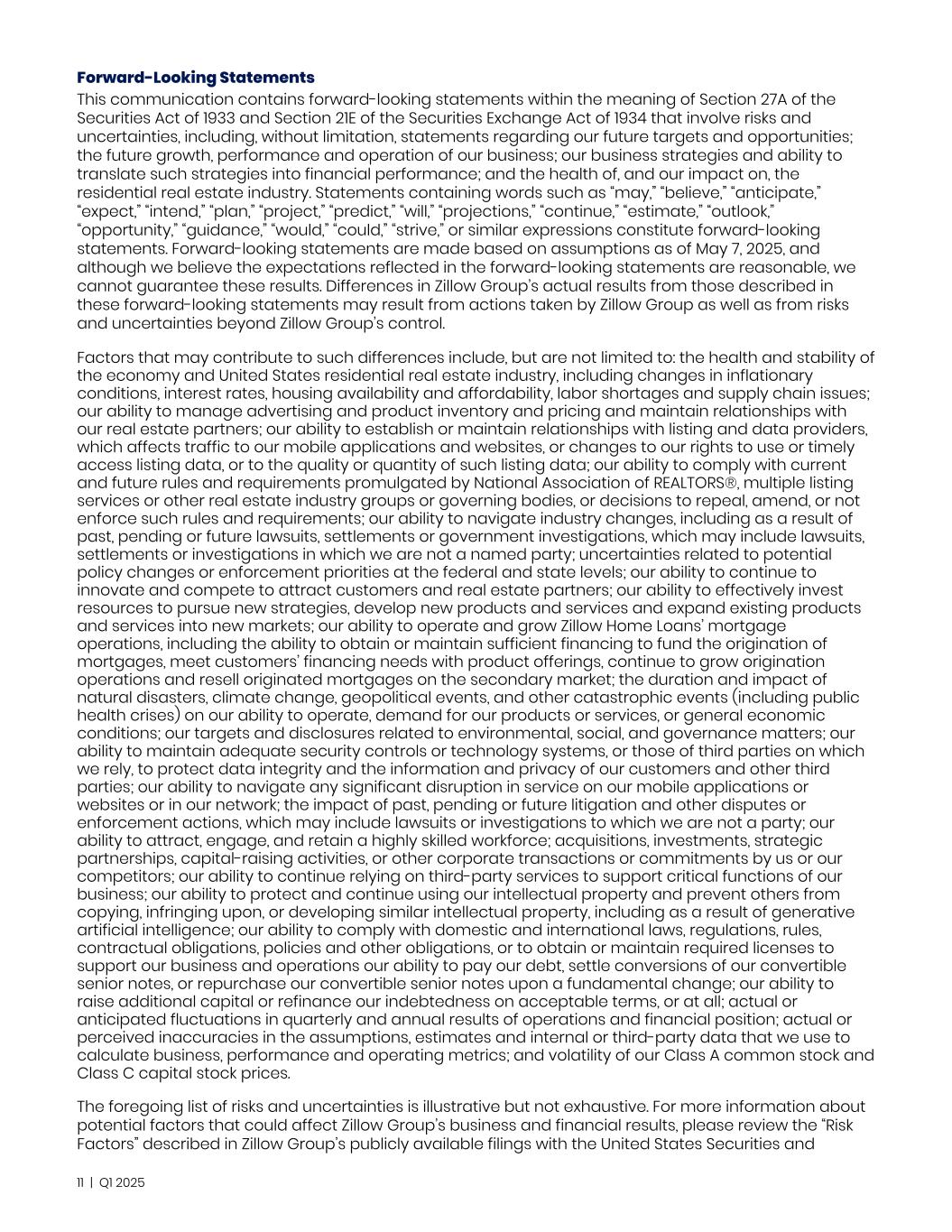 前瞻性陈述本通讯包含1933年《证券法》第27A条和1934年《证券交易法》第21E条含义内的前瞻性陈述,这些陈述涉及风险和不确定性,包括但不限于关于我们未来目标和机会的陈述;我们业务的未来增长、业绩和运营;我们的业务战略和将这些战略转化为财务业绩的能力;以及住宅房地产行业的健康状况和我们对该行业的影响。包含“可能”、“相信”、“预期”、“预期”、“打算”、“计划”、“项目”、“预测”、“将”、“预测”、“继续”、“估计”、“展望”、“机会”、“指导”、“将”、“可能”、“努力”或类似表述等词语的陈述构成前瞻性陈述。前瞻性陈述是基于截至2025年5月7日的假设作出的,尽管我们认为前瞻性陈述中反映的预期是合理的,但我们不能保证这些结果。Zillow Group的实际结果与这些前瞻性陈述中描述的结果存在差异,这可能是由于Zillow Group采取的行动,也可能是由于Zillow Group无法控制的风险和不确定性造成的。可能导致这种差异的因素包括但不限于:经济和美国住宅房地产行业的健康和稳定,包括通胀状况、利率、住房供应和负担能力、劳动力短缺和供应链问题的变化;我们管理广告和产品库存和定价以及与房地产合作伙伴保持关系的能力;我们与房源和数据提供商建立或维持关系的能力,这会影响我们移动应用程序和网站的流量,或我们使用或及时访问房源数据的权利发生变化,或此类上市数据的质量或数量;我们遵守美国全国房地产经纪人协会颁布的当前和未来规则和要求的能力®、多个上市服务或其他房地产行业集团或理事机构,或决定废除、修订或不执行此类规则和要求;我们驾驭行业变化的能力,包括由于过去、未决或未来的诉讼、和解或政府调查,其中可能包括诉讼,我们不是被指名方的和解或调查;与联邦和州一级潜在的政策变化或执法优先事项相关的不确定性;我们持续创新和竞争以吸引客户和房地产合作伙伴的能力;我们有效投入资源以追求新战略、开发新产品和服务以及将现有产品和服务扩展到新市场的能力;我们运营和发展Zillow Home Loans的抵押贷款业务的能力,包括获得或维持足够的融资以资助抵押贷款发起的能力,通过产品供应满足客户的融资需求,继续扩大发起业务并在二级市场上转售发起的抵押贷款;自然灾害、气候变化、地缘政治事件和其他灾难性事件(包括公共卫生危机)对我们的运营能力、对我们的产品或服务的需求或总体经济状况的持续时间和影响;我们与环境、社会和治理事项相关的目标和披露;我们维持足够的安全控制或技术系统的能力,或我们所依赖的第三方的安全控制或技术系统的能力,保护数据完整性以及我们的客户和其他第三方的信息和隐私;我们在移动应用程序或网站或我们的网络中导航任何重大服务中断的能力;过去、未决或未来诉讼和其他纠纷或执法行动的影响,其中可能包括我们不是当事方的诉讼或调查;我们吸引、聘用和留住高技能劳动力的能力;收购、投资、战略合作伙伴关系、筹资活动,或我们或我们的竞争对手的其他公司交易或承诺;我们继续依赖第三方服务以支持我们业务的关键功能的能力;我们保护和继续使用我们的知识产权并防止他人复制、侵犯或开发类似知识产权的能力,包括由于生成人工智能的结果;我们遵守国内和国际法律、法规、规则、合同义务、政策和其他义务的能力,或获得或维持所需的许可以支持我们的业务和运营我们支付债务、结算可转换优先票据转换的能力, 或在发生根本性变化时回购我们的可转换优先票据;我们以可接受的条款筹集额外资本或为我们的债务再融资的能力,或根本没有;季度和年度经营业绩和财务状况的实际或预期波动;我们用于计算业务、业绩和经营指标的假设、估计和内部或第三方数据中实际或感知到的不准确;以及我们的A类普通股和C类资本股票价格的波动性。上述风险和不确定性清单是说明性的,但并非详尽无遗。有关可能影响Zillow Group的业务和财务业绩的潜在因素的更多信息,请查阅Zillow Group向美国证券公司提交的公开文件中描述的“风险因素”以及11 | 2025年第一季度