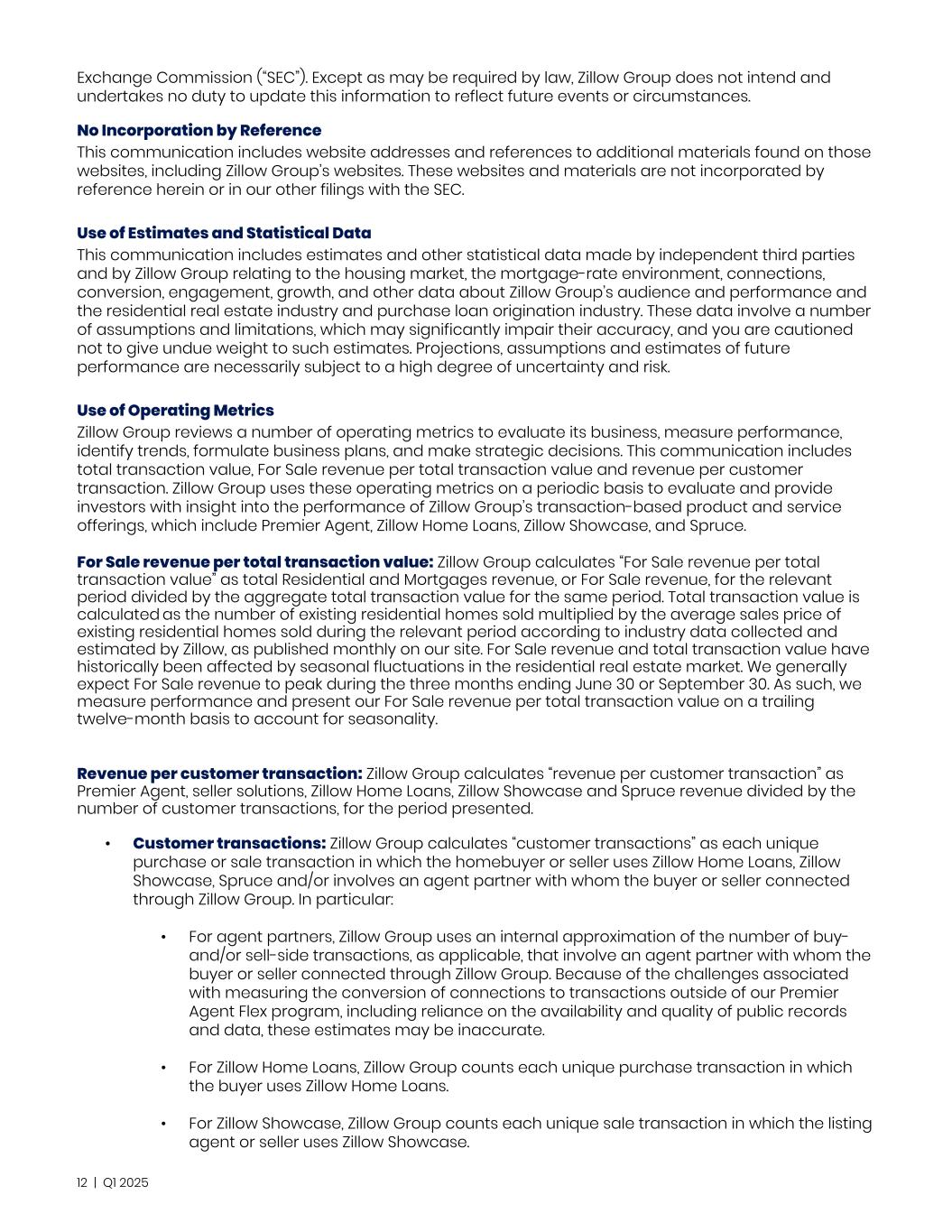 交易委员会(“SEC”)。除法律可能要求外,Zillow Group不打算也不承担更新这些信息以反映未来事件或情况的义务。不以引用方式纳入本通讯包含网站地址和对在这些网站上找到的其他材料的引用,包括Zillow Group的网站。这些网站和材料未通过引用并入本文或我们向SEC提交的其他文件中。估计和统计数据的使用本通讯包括独立第三方和Zillow Group作出的有关住房市场、抵押贷款利率环境、连接、转换、参与度、增长以及有关Zillow Group的受众和业绩以及住宅房地产行业和购买贷款发放行业的其他数据的估计和其他统计数据。这些数据涉及许多假设和限制,这可能会严重损害其准确性,请注意不要对此类估计给予不应有的权重。对未来业绩的预测、假设和估计必然具有高度的不确定性和风险性。使用运营指标Zillow Group会审查一些运营指标来评估其业务、衡量绩效、识别趋势、制定业务计划并做出战略决策。该通信包括总交易价值、每总交易价值的For Sale收入和每客户交易的收入。Zillow Group定期使用这些运营指标来评估并为投资者提供有关Zillow Group基于交易的产品和服务产品表现的洞察力,这些产品和服务包括Premier Agent、Zillow Home Loans、Zillow Showcase和Spruce。对于每项总交易价值的出售收入:Zillow Group计算“每项总交易价值的出售收入”为相关期间的住宅和抵押贷款总收入,或出售收入除以同期的总交易价值。总成交金额根据Zillow收集和估算的行业数据,按每月在我们网站上发布的数据,计算为现房住宅销售数量乘以相关期间现房住宅销售均价。销售收入和成交总金额历来受住宅房地产市场季节性波动的影响。我们通常预计,For Sale收入将在截至6月30日或9月30日的三个月内达到峰值。因此,我们衡量业绩,并在过去12个月的基础上提出我们的每总交易价值的待售收入,以考虑季节性。每客户交易收入:Zillow Group计算“每客户交易收入”为Premier Agent、卖方解决方案、Zillow Home Loans、Zillow Showcase和Spruce收入除以所示期间的客户交易数量。•客户交易:Zillow Group将“客户交易”计算为购房者或卖方使用Zillow Home Loans、Zillow Showcase、Spruce和/或涉及买方或卖方通过Zillow Group与其建立联系的代理合作伙伴的每笔独特的购买或销售交易。特别是:•对于代理合作伙伴,Zillow Group使用买方和/或卖方交易数量(如适用)的内部近似值,其中涉及买方或卖方通过Zillow Group与之建立联系的代理合作伙伴。由于与衡量我们的Premier Agent Flex计划之外的交易的连接转换相关的挑战,包括依赖公共记录和数据的可用性和质量,这些估计可能是不准确的。•对于Zillow房屋贷款,Zillow Group会统计买方使用Zillow房屋贷款的每笔独特的购买交易。•对于Zillow Showcase,Zillow Group会统计上市代理或卖家使用Zillow Showcase的每笔独特的销售交易。12 | 2025年第一季度