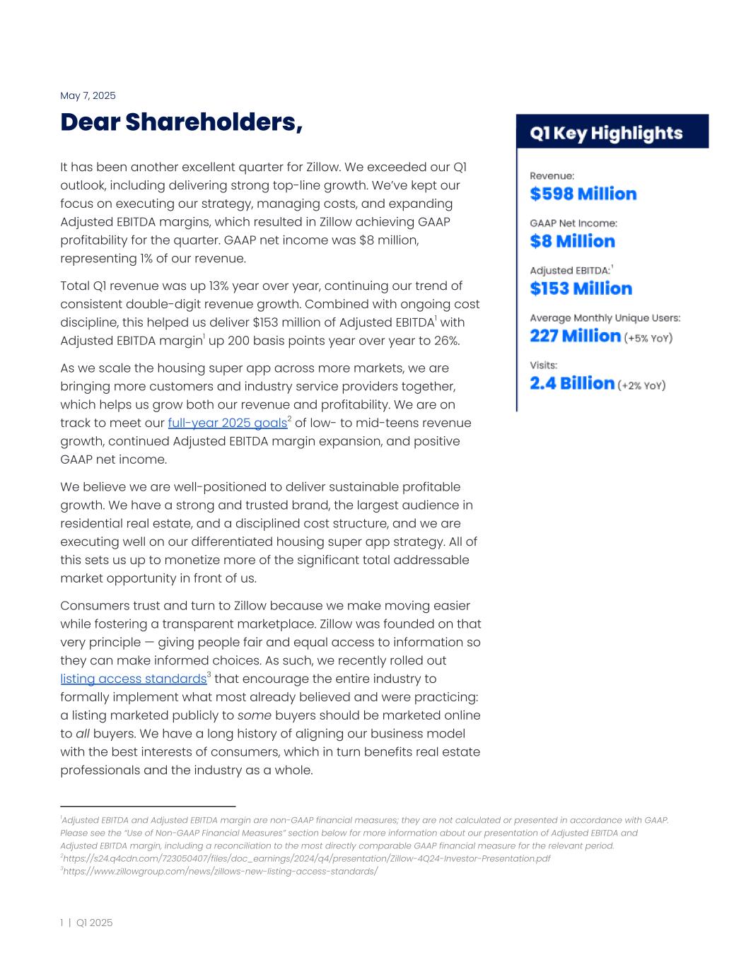 2025年5月7日尊敬的股东您好,这是Zillow又一个出色的季度。我们超出了第一季度的预期,包括实现了强劲的收入增长。我们一直专注于执行我们的战略、管理成本和扩大调整后的EBITDA利润率,这使得Zillow在本季度实现了GAAP盈利。GAAP净收入为800万美元,占我们收入的1%。Q1总收入同比增长13%,延续了我们收入持续两位数增长的趋势。再加上持续的成本纪律,这帮助我们实现了1.53亿美元的调整后EBITDA 1,调整后EBITDA利润率1同比增长200个基点,达到26%。随着我们将住房超级应用程序扩展到更多市场,我们正在将更多的客户和行业服务提供商聚集在一起,这有助于我们增加收入和盈利能力。我们有望实现2025年全年目标2,即收入增长保持在十几岁左右,调整后EBITDA利润率持续扩大,GAAP净收入为正。我们相信,我们有能力实现可持续的盈利增长。我们拥有强大且值得信赖的品牌、住宅地产最大的受众群体、严格的成本结构,我们在差异化的住房超级APP战略上执行得很好。所有这一切都使我们能够将更多摆在我们面前的重要的总可寻址市场机会货币化。消费者信任并转向Zillow,因为我们让搬家变得更容易,同时培养了一个透明的市场。Zillow正是基于这一原则——让人们公平、平等地获得信息,这样他们就可以做出明智的选择。因此,我们最近推出了房源准入标准3,鼓励整个行业正式实施大多数人已经相信并正在实践的做法:向一些买家公开营销的房源应该在网上向所有买家营销。我们在使我们的商业模式与消费者的最佳利益保持一致方面有着悠久的历史,这反过来又有利于房地产专业人士和整个行业。3 https://www.zillowgroup.com/news/zillows-new-listing-access-standards/2 https://s24.q4cdn.com/723050407/files/doc_earnings/2024/q4/presentation/Zillow-4Q24-investor-presentation.pdf 1调整后EBITDA和调整后EBITDA利润率是非公认会计准则财务指标;它们不是按照公认会计准则计算或列报的。有关我们列报调整后EBITDA和调整后EBITDA利润率的更多信息,包括与相关期间最直接可比的GAAP财务指标的对账,请参阅下面的“非GAAP财务指标的使用”部分。1 | 2025年第一季度