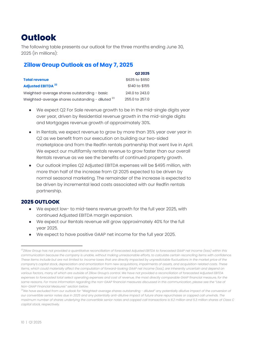 展望下表列出了我们对截至2025年6月30日止三个月的展望(百万):2223 ●我们预计Q2可售收入同比增长将在中个位数,受住宅收入增长中个位数和按揭收入增长约30%的推动。●在租金方面,我们预计第二季度的收入将同比增长35%以上,因为我们受益于我们建立双边市场的执行以及4月份上线的Redfin租赁合作伙伴关系。我们预计,由于我们看到了持续的房地产增长带来的好处,我们的多户家庭租赁收入的增长速度将超过我们的整体租赁收入。●我们的展望意味着,第二季度调整后EBITDA费用将为4.95亿美元,预计比2025年第一季度增长的一半以上将由正常的季节性营销推动。预计增长的其余部分将受到与我们的Redfin租赁合作伙伴关系相关的潜在客户成本增加的推动。2025年展望●我们预计2025年全年收入将出现中低档增长,调整后EBITDA利润率将继续扩大。●我们预计2025年全年我们的租金收入将增长约40%。●我们预计2025年全年将有正的GAAP净收入。23我们已将2025年到期的可转换优先票据转换的任何潜在摊薄影响以及未来股票回购或上限赎回解除的任何潜在反摊薄影响从我们对“加权平均已发行股份-稀释”的展望中排除。可转换优先票据和上限认购交易的相关股份数量上限分别为620万股和530万股C类股本。22Zillow Group没有在本通讯中提供预测调整后EBITDA与预测GAAP净收入(亏损)的量化对账,因为该公司无法在不做出不合理努力的情况下自信地计算某些对账项目。这些项目包括但不限于:受公司股本市场价格不可预测波动直接影响的所得税、新收购产生的折旧和摊销、资产减值、收购相关成本等。这些项目可能会对前瞻性GAAP净收入(亏损)的计算产生重大影响,但这些项目本质上是不确定的,取决于各种因素,其中许多因素都在Zillow Group的控制范围之外。出于同样的原因,我们没有提供预测的调整后EBITDA费用与预测的总精选运营费用和收入成本(最直接可比的GAAP财务指标)的对账。有关本通讯中讨论的非GAAP财务指标的更多信息,请参阅下面的“非GAAP财务指标的使用”部分。10 | 2025年第一季度