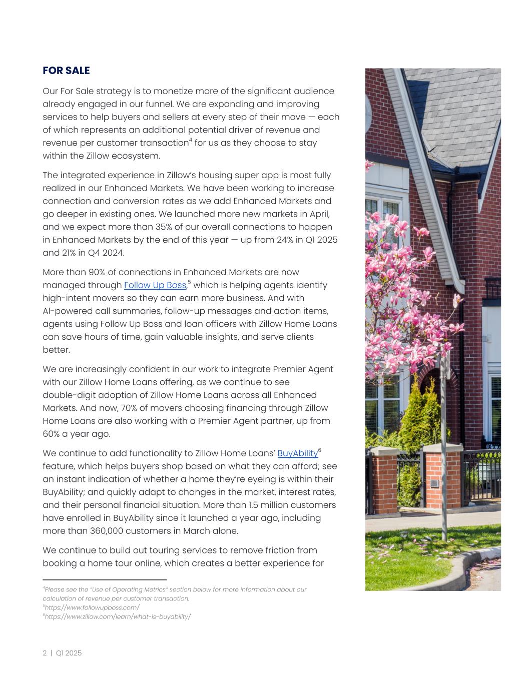 出售我们的出售策略是将更多已经参与我们漏斗的重要受众货币化。我们正在扩展和改进服务,以帮助买家和卖家在他们移动的每一步——当他们选择留在Zillow生态系统中时,每一步对我们来说都代表着额外的收入和每笔客户交易收入的潜在驱动因素4。Zillow住房超级APP中的集成体验,在我们的增强型市场中实现得最为充分。我们一直在努力提高连接和转化率,因为我们增加了增强型市场,并在现有市场中走得更深。我们在4月份推出了更多新市场,我们预计到今年年底,超过35%的整体连接将发生在增强型市场——高于2025年第一季度的24%和2024年第四季度的21%。增强市场中超过90%的连接现在通过Follow Up Boss,5进行管理,该公司正在帮助代理商识别高意向的搬运工,这样他们就可以赚取更多的业务。并且通过AI驱动的电话摘要、后续消息和行动项目,使用Zillow房贷的Follow-Up Boss和信贷员的代理可以节省数小时的时间,获得有价值的见解,并更好地服务客户。我们对将Premier Agent与我们的Zillow Home Loans产品整合的工作越来越有信心,因为我们继续看到Zillow Home Loans在所有增强市场上的采用达到两位数。而现在,70%选择通过Zillow Home Loans进行融资的搬家公司也在与Premier Agent合作伙伴合作,而一年前这一比例为60%。我们继续在Zillow Home Loans的BuyAbility6功能中添加功能,该功能帮助购房者根据他们能负担得起的东西进行购物;看到他们所关注的房屋是否在他们的购买能力范围内的即时指示;并迅速适应市场、利率和个人财务状况的变化。BuyAbility自一年前推出以来,已有超过150万名客户注册,其中仅3月份就有超过36万名客户。我们继续构建旅游服务,以消除在线预订家庭旅游的摩擦,这为6 https://www.zillow.com/learn/what-is-buyability/5 https://www.followupboss.com/创造了更好的体验。4有关我们计算每笔客户交易收入的更多信息,请参阅下面的“运营指标的使用”部分。2 | 2025年第一季度