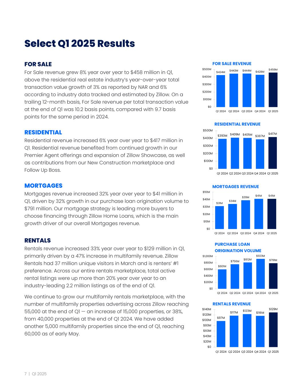 Select Q1 2025 results for sale for sale for sale第一季度收入同比增长8%至4.58亿美元,高于NAR报告的住宅房地产行业总交易价值同比增长3%和Zillow跟踪和估计的行业数据6%。在过去12个月的基础上,第一季度末每笔总交易价值的待售收入为10.2个基点,而2024年同期为9.7个基点。Residential Residential Q1营收4.17亿美元同比增长6%。住宅收入受益于我们的Premier Agent产品的持续增长和Zillow Showcase的扩展,以及我们的新建筑市场和后续BOSS的贡献。MORTGAGES Mortgages第一季度收入同比增长32%至4100万美元,这得益于我们的购买贷款发起量增长32%至7.91亿美元。我们的抵押贷款策略正在引导更多的买家选择通过Zillow住房贷款进行融资,这是我们整体抵押贷款收入的主要增长动力。第一季度RNTALS租赁收入同比增长33%至1.29亿美元,主要受多户家庭收入增长47%的推动。Zillow Rentals在3月份有3700万独立访客,是租客的# 1首选。在我们整个租赁市场中,截至第一季度末,总活跃租赁房源同比增长超过20%,达到行业领先的220万套房源。我们继续扩大我们的多户出租市场,Zillow的多户房产广告数量在第一季度末达到55,000处——比2024年第一季度末的40,000处增加了15,000处,即38%。自Q1末以来,我们又增加了5000套多户住宅,截至5月初达到了6万套。7 | 2025年第一季度
