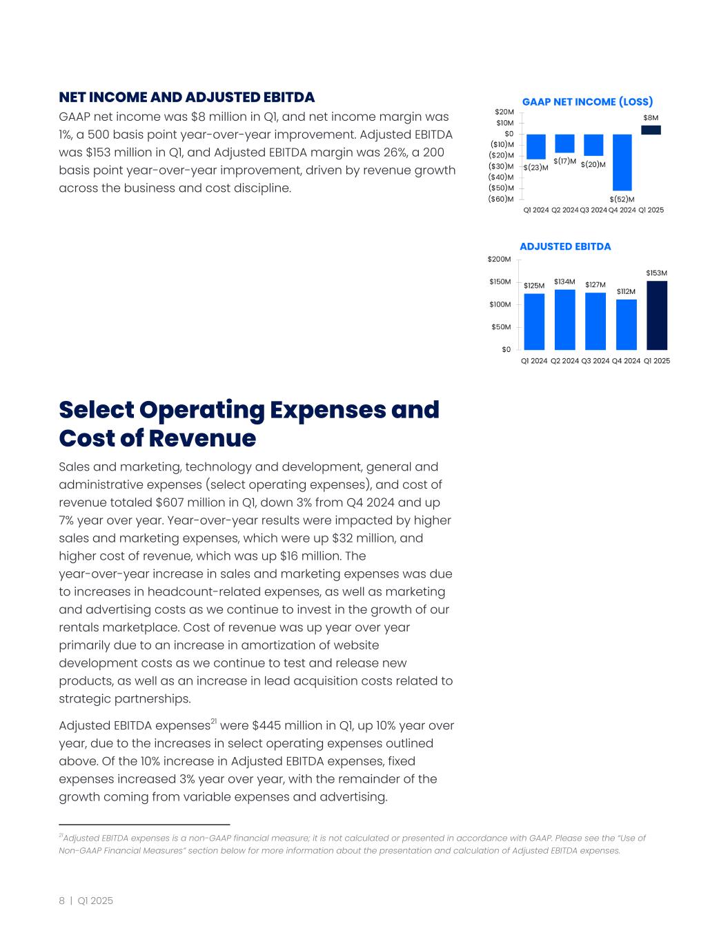 第一季度净收入和调整后EBITDA GAAP净收入为800万美元,净利润率为1%,同比提高500个基点。第一季度调整后EBITDA为1.53亿美元,调整后EBITDA利润率为26%,同比提高200个基点,这得益于整个业务的收入增长和成本纪律。Select Operating Expenses and Cost of Revenue Sales and Marketing,Technology and Development,General and Administrative Expenses(Select Operating Expenses)(Select Operating Expenses),Q1营收成本总计6.07亿美元,较2024年Q4下降3%,同比增长7%。同比业绩受到销售和营销费用增加的影响,增加了3200万美元,收入成本增加了1600万美元。销售和营销费用的同比增长是由于与员工人数相关的费用以及营销和广告费用的增加,因为我们继续投资于租赁市场的增长。收入成本同比上升主要是由于随着我们继续测试和发布新产品,网站开发成本的摊销增加,以及与战略合作伙伴关系相关的潜在客户获取成本增加。由于上述特定运营费用的增加,第一季度调整后EBITDA费用21为4.45亿美元,同比增长10%。在调整后EBITDA费用增长10%中,固定费用同比增长3%,其余增长来自可变费用和广告。21调整后EBITDA费用是一种非GAAP财务指标;它不是按照GAAP计算或列报的。有关调整后EBITDA费用的列报和计算的更多信息,请参阅下面的“非GAAP财务指标的使用”部分。8 | 2025年第一季度