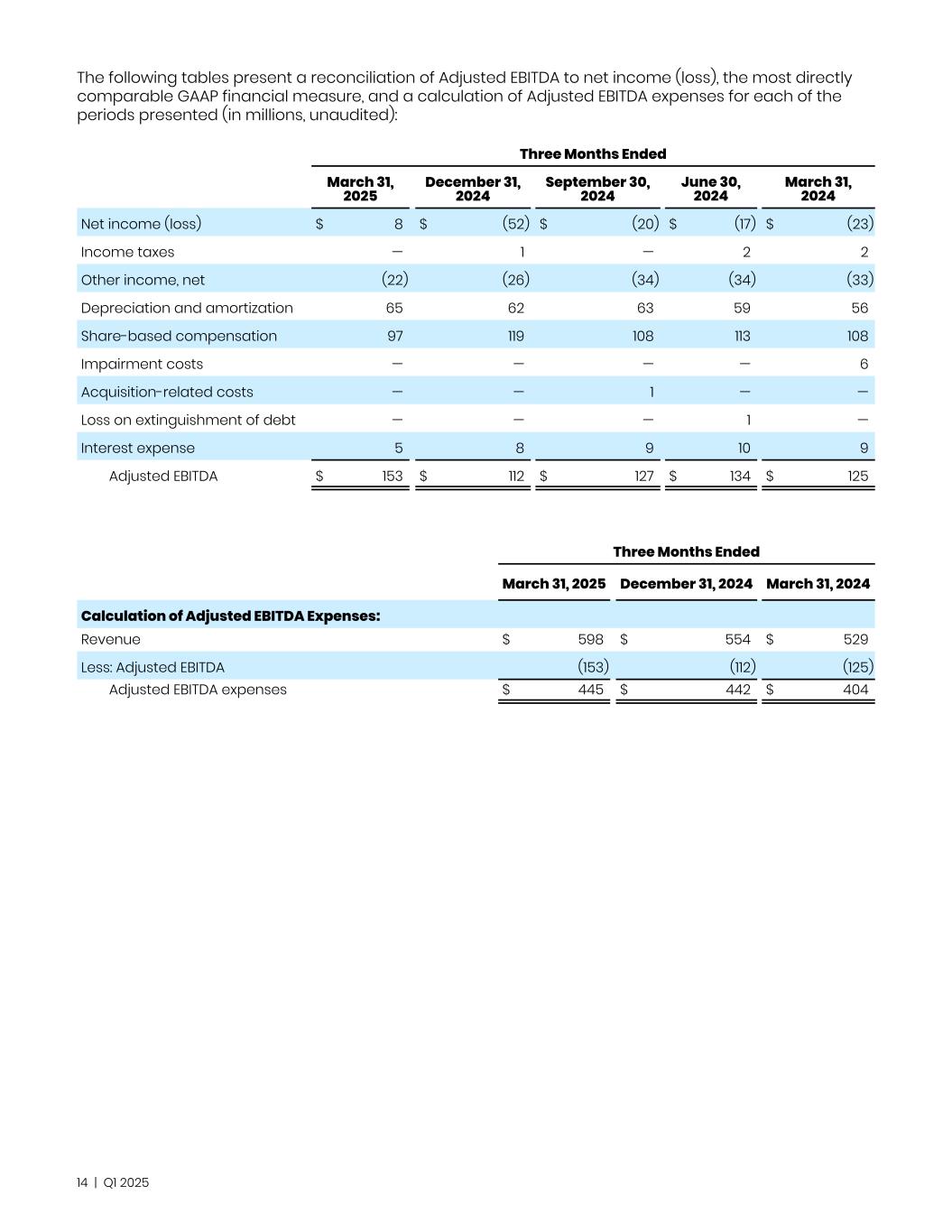 下表列出了调整后EBITDA与净收入(亏损)的对账,这是最直接可比的GAAP财务指标,以及所列各期间调整后EBITDA费用的计算(单位:百万,未经审计):截至2025年3月31日的三个月2024年12月31日2024年9月30日2024年6月30日2024年3月31日净收入(亏损)$ 8 $(52)$(20)$(17)$(23)所得税— 1 — 22其他收入,净额(22)(26)(34)(34)(33)折旧和摊销6562635956股份补偿97119108113108减值成本—————— 6收购相关成本———— 1 ——债务清偿损失———— 1 ——利息费用589109调整后EBITDA 153美元112美元127美元— 134美元— 125美元截至2025年3月31日的三个月2024年12月31日,2024年调整后EBITDA费用计算:收入598美元554美元529美元减:调整后EBITDA(153)(112)(125)调整后EBITDA费用445美元442美元404美元14 | 2025年第一季度