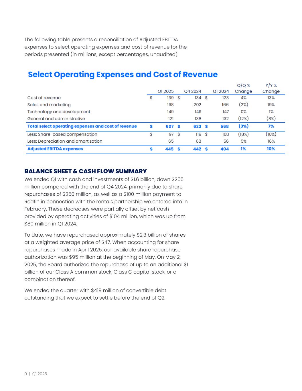 下表列出了调整后EBITDA费用的对账,以选择所示期间的运营费用和收入成本(单位:百万,百分比除外,未经审计):资产负债表和现金流摘要我们在第一季度末的现金和投资为16亿美元,与2024年第四季度末相比减少了2.55亿美元,主要是由于2.5亿美元的股票回购,以及就我们在2月份建立的租金合作伙伴关系向Redfin支付的1亿美元。这些减少被经营活动提供的1.04亿美元的净现金部分抵消,而2024年第一季度的净现金为8000万美元。到目前为止,我们已经以47美元的加权平均价格回购了大约23亿美元的股票。在计入2025年4月进行的股票回购时,我们在5月初的可用股票回购授权为9500万美元。2025年5月2日,董事会授权回购最多10亿美元的我们的A类普通股、C类股本或其组合。我们在本季度末有4.19亿美元的未偿可转换债务,我们预计将在第二季度末之前结清。9 | 2025年第一季度