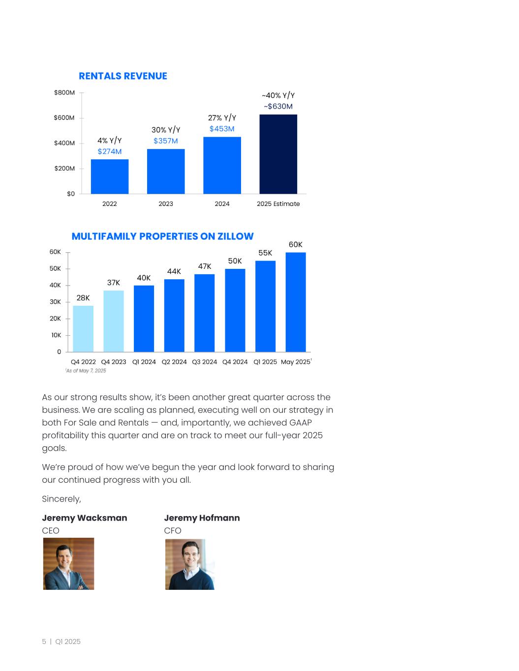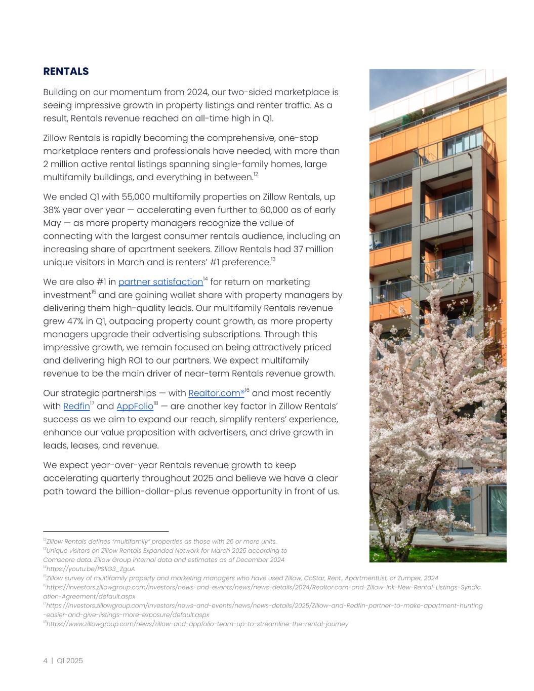 从2024年开始,租赁将在我们的势头基础上再接再厉,我们的双边市场正在看到令人印象深刻的房地产房源和租客流量增长。因此,租金收入在第一季度达到了历史最高水平。Zillow Rentals正在迅速成为租房者和专业人士所需要的综合性、一站式市场,有超过200万个活跃的出租房源,涵盖单户住宅、大型多户建筑,以及介于两者之间的一切。12我们在第一季度结束时在Zillow Rentals上拥有55,000套多户住宅,同比增长38% ——截至5月初甚至进一步加速至60,000套——因为越来越多的物业经理认识到与最大的消费者租赁受众建立联系的价值,其中包括越来越多的公寓寻求者。Zillow Rentals在3月份有3700万独立访客,是租房者的# 1首选。13我们在营销投资回报率方面也是合作伙伴满意度# 14 15,并且正在通过向物业经理提供高质量的潜在客户来获得他们的钱包份额。随着越来越多的物业经理升级他们的广告订阅,我们的多户家庭租赁收入在第一季度增长了47%,超过了物业数量的增长。通过这一令人印象深刻的增长,我们仍然专注于具有吸引力的价格并为我们的合作伙伴提供高投资回报率。我们预计多户家庭收入将成为近期租金收入增长的主要驱动力。我们的战略合作伙伴关系—与Realtor.com®16和最近的Redfin17和AppFolio18 ——是Zillow Rentals成功的另一个关键因素,因为我们的目标是扩大我们的覆盖范围,简化租客的体验,增强我们与广告商的价值主张,并推动潜在客户、租约和收入的增长。我们预计,在整个2025年,租金收入同比增长将保持季度加速,并相信我们有一条通往摆在我们面前的十亿美元以上收入机会的清晰道路。18 https://www.zillowgroup.com/news/zillow-and-appfolio-team-up-to-streamline-the-rental-journey 17 https://investors.zillowgroup.com/investors/news-and-events/news/news-details/2025/Zillow-and-Redfin-partner-to-make-apartment-hunt-easier-and-give-listings-more-exposure/default.aspx 16 https://investors.zillowgroup.com/investors/news-and-events/news/news-details/2024/realtor.com-and-zillow-ink-new-rZillow Group截至2024年12月的内部数据和估计12Zillow Rentals将“多户”物业定义为拥有25个或更多单元的物业。4 | 2025年第一季度