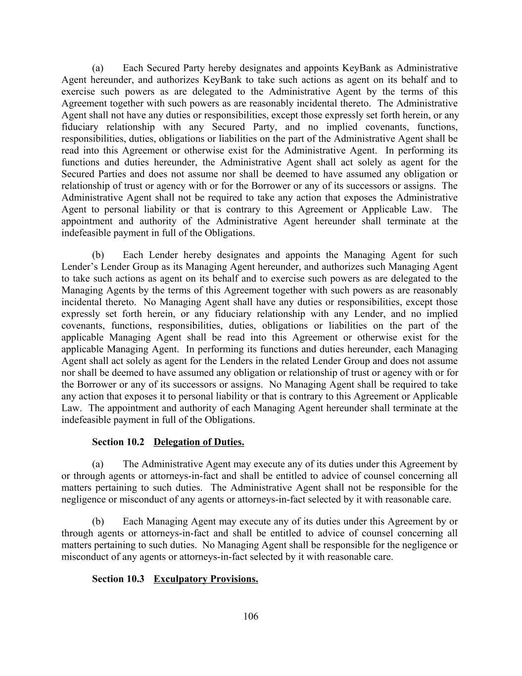 (a)每一有担保方特此指定和任命KeyBank为本协议项下的行政代理人,并授权KeyBank以代理人身份代表其采取行动,并行使本协议条款授予行政代理人的权力以及合理附带的权力。行政代理人不得有任何义务或责任,但本协议明文规定的除外,或与任何有担保方的任何受托关系,行政代理人一方的默示约定、职能、责任、义务、义务或责任不得理解为本协议或以其他方式为行政代理人存在。行政代理人履行其在本协议项下的职能和职责,应仅作为有担保当事人的代理人,不承担也不应被视为与借款人或其任何继承人或受让人承担或为其承担任何信托或代理义务或关系。不得要求行政代理人采取任何使行政代理人承担个人责任或违反本协议或适用法律的行为。本协议项下行政代理人的委任和授权,应于不可撤销的全额支付义务时终止。(b)每一贷款人特此指定并委任该贷款人的贷款人集团的管理代理人为其根据本协议所规定的管理代理人,并授权该管理代理人以代理人身份代表其采取行动,并行使本协议条款授予管理代理人的权力以及合理附带的权力。除本协议明文规定的义务或责任外,任何管理代理人不得有任何义务或责任,或与任何贷款人的任何信托关系,适用的管理代理人方面的默示契约、职能、责任、义务、义务或责任不得解读为本协议或适用的管理代理人以其他方式存在。各管理代理人在履行本协议规定的职能和职责时,应仅作为相关贷款人集团内贷款人的代理人,不承担也不应被视为与借款人或其任何继承人或受让人承担或为其承担任何信托或代理义务或关系。不得要求管理代理人采取任何使其承担个人责任或违反本协议或适用法律的行为。本协议项下各经理人的委任和授权,应于不可撤销的全额支付义务时终止。第10.2节职责下放。(a)行政代理人可由或透过代理人或事实上的律师执行其在本协议下的任何职责,并有权就与该职责有关的所有事项获得大律师的意见。行政代理人不得对其合理谨慎选择的任何代理人或事实上的律师的疏忽或不当行为承担责任。(b)每一管理代理人可由或通过代理人或事实上的律师执行其在本协议下的任何职责,并有权就与此种职责有关的所有事项获得大律师的咨询意见。任何管理代理人不得对其合理谨慎选择的任何代理人或事实上的律师的疏忽或不当行为负责。第10.3节免责条款。106