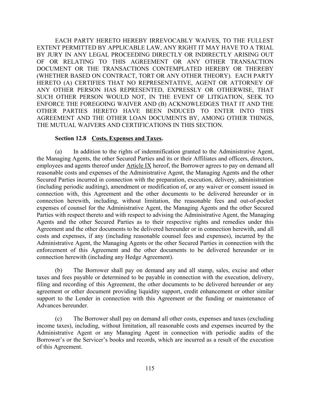 本协议每一方在此不可撤销地放弃在适用法律允许的最充分范围内,在直接或间接产生于或与本协议或任何其他交易文件或由此设想的交易(无论是基于合同、侵权或任何其他理论)有关的任何法律程序中其可能拥有的由陪审团审判的任何权利。此处的每一方(a)证明没有任何其他人的代表、代理人或代理人明示或以其他方式代表该其他人在发生诉讼时不会寻求强制执行上述豁免,并且(b)承认其和此处的其他方已被诱导订立本协议和其他贷款文件,其中包括第12.8节成本、费用和税收。(a)除根据本协议第九条授予行政代理人、管理代理人、其他有担保方及其附属机构和高级管理人员、董事、雇员及其代理人的赔偿权利外,借款人同意按要求支付行政代理人、管理代理人和其他有担保方因编制、执行、交付、管理(包括定期审计)、修改或修改、或与之相关的任何放弃或同意而产生的所有合理成本和费用,本协议及根据本协议交付或与本协议有关的其他文件,包括但不限于行政代理人、管理代理人和其他有担保当事人的律师的合理费用和自付费用,以及就行政代理人、管理代理人和其他有担保当事人各自在本协议项下的权利和补救办法以及根据本协议或与本协议有关的其他文件交付的权利和补救办法,以及行政代理人发生的一切费用和开支(如有)(包括合理的律师费用和开支),管理代理或其他有担保方就本协议的强制执行以及根据本协议或与本协议有关的其他文件(包括任何对冲协议)交付。(b)借款人应按要求支付与本协议的执行、交付、归档和记录、根据本协议将交付的其他文件或就本协议或根据本协议提供资金或维持垫款向贷款人提供流动性支持、信用增级或其他类似支持的任何协议或其他文件有关的任何和所有应付或确定应付的印花、销售、消费税和其他税费。(c)借款人应按要求支付所有其他成本、费用和税款(不包括所得税),包括但不限于行政代理人或任何管理代理人因执行本协议而产生的与定期审计借款人或服务人的簿册和记录有关的所有合理成本和费用。115