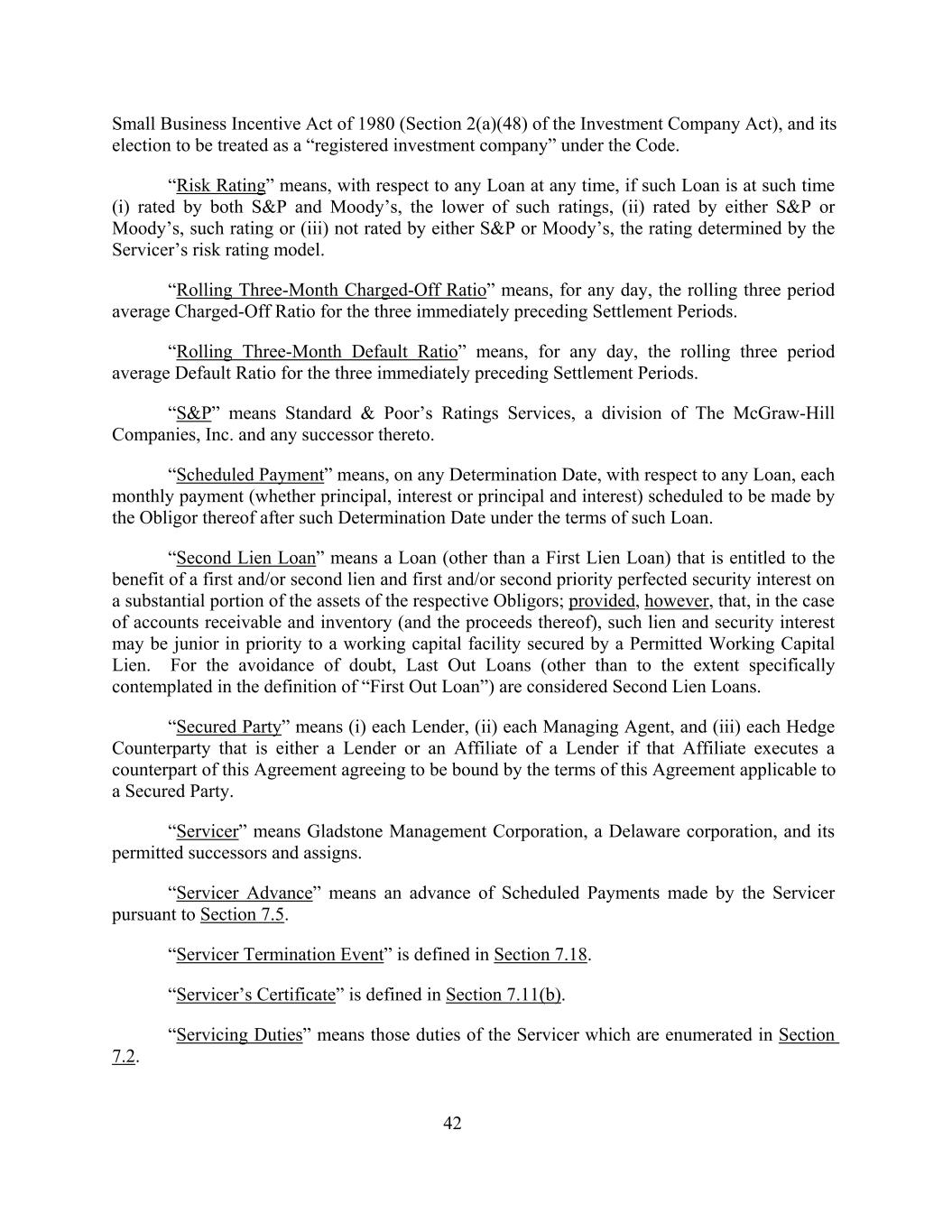 1980年《小企业激励法案》(《投资公司法》第2(a)(48)节),并选举其被视为《守则》规定的“注册投资公司”。“风险评级”是指,就任何时间的任何贷款而言,如果该等贷款在该时间(i)同时获得标普和穆迪的评级,则为该等评级中的较低者,(ii)获得标普或穆迪任何一方的评级,则该等评级或(iii)未获得标普或穆迪任何一方的评级,则为服务商风险评级模型确定的评级。“滚动三个月核销比例”是指,对于任意一天,前三个结算期的滚动三期平均核销比例。“滚动三个月违约率”是指,对于任何一天,前三个结算期的滚动三期平均违约率。“标普”是指标准普尔评级服务公司,麦格劳-希尔公司(McGraw-Hill Companies,Inc.)的一个部门及其任何继任者。“按期付款”是指,在任何确定日期,就任何贷款而言,其债务人在该确定日期之后根据该贷款的条款计划支付的每个月付款(无论是本金、利息还是本金和利息)。“第二留置权贷款”是指有权获得第一和/或第二留置权以及第一和/或第二优先权完善的担保权益的贷款(第一留置权贷款除外),其资产相当一部分为相应的债务人;但前提是,在应收账款和存货(及其收益)的情况下,此类留置权和担保权益的优先权可能低于由许可的营运资金留置权担保的营运资金融资。为免生疑问,Last Out Loans(“First Out Loan”定义中具体设想的范围除外)被视为第二留置权贷款。“担保方”是指(i)每个贷款人,(ii)每个管理代理人,以及(iii)每个对冲交易对手,如果该关联公司执行本协议的对应方同意受适用于担保方的本协议条款的约束,则该对冲方要么是贷款人,要么是贷款人的关联公司。“服务人”是指特拉华州公司Gladstone Management Corporation及其允许的继任者和受让人。“服务商垫款”是指服务商根据第7.5节进行的预定付款的垫款。“服务器终止事件”在第7.18节中定义。“服务人证书”在第7.11(b)节中定义。“服务职责”是指第7.2节中列举的服务人员的职责。42