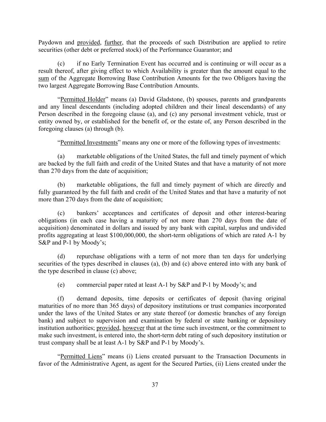 偿付,并进一步规定,此类分配的收益将用于履约担保人的退休证券(其他债务或优先股);(c)如果没有发生提前终止事件,并且正在继续或将因此发生,则在生效后,其可用性大于等于具有两个最大总借款基础贡献金额的两个义务人的总借款基础贡献金额之和的金额。“许可持有人”是指(a)David Gladstone,(b)上述(a)条所述任何人的配偶、父母和祖父母以及任何直系后代(包括收养的子女及其直系后代),以及(c)由上述(a)至(b)条所述任何人拥有或为其利益而设立的任何个人投资工具、信托或实体,或为其遗产而设立的任何个人投资工具、信托或实体。“许可投资”是指以下任何一种或多种投资:(a)美国的可销售债务,其全额和及时付款有美国的完全信用和信用支持,期限自收购之日起不超过270天;(b)可销售债务,全额和及时付款由美国的完全信用和信用直接和充分保证,且期限自购置之日起不超过270天;(c)以美元计价并由任何银行发行的资本、盈余和未分割利润总额至少为100,000,000美元的银行承兑汇票和存款证以及其他计息债务(在每种情况下期限不超过自购置之日起270天),其短期债务获标普评级为A-1,获穆迪评级为P-1;(d)与上述(a)、(b)和(c)条所述类型的任何银行就上述(c)条所述类型的基础证券订立的期限不超过十天的回购义务;(e)至少获标普评级为A-1及获穆迪评级为P-1的商业票据;及(f)活期存款,根据美国或其任何州的法律注册成立的存款机构或信托公司(或任何外国银行的国内分支机构)的定期存款或存单(原始期限不超过365天),并接受联邦或州银行或存款机构当局的监督和审查;但前提是在订立该等投资或作出该等投资的承诺时,该存款机构或信托公司的短期债务评级应至少为标普的A-1和穆迪的P-1。“许可留置权”指(i)根据交易文件以行政代理人(作为有担保当事人的代理人)为受益人设定的留置权,(ii)根据37