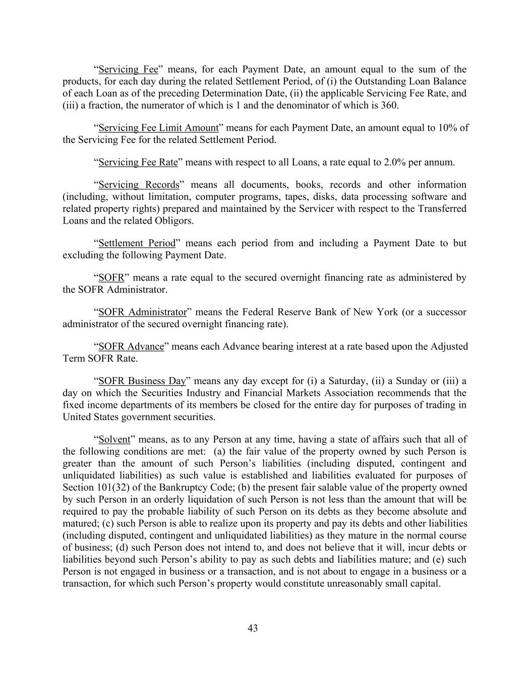 “服务费”是指就每个付款日期而言,在相关结算期内的每一天,(i)截至前一确定日期的每笔贷款的未偿还贷款余额,(ii)适用的服务费率,以及(iii)一个零头,其分子为1,分母为360。“服务费限额金额”是指每个支付日,金额等于相关结算期服务费的10%。“服务费率”是指就所有贷款而言,相当于每年2.0%的费率。「服务记录」指服务人就所转让贷款及有关债务人而编制及维持的所有文件、簿册、记录及其他资料(包括但不限于计算机程序、磁带、磁盘、数据处理软件及相关产权)。“结算期”是指从(包括)一个付款日期到但不包括以下付款日期的每个期间。“SOFR”是指与SOFR管理人管理的有担保隔夜融资利率相等的利率。“SOFR管理人”是指纽约联邦储备银行(或担保隔夜融资利率的继任管理人)。“SOFR垫款”是指每笔垫款按基于调整后期限SOFR利率的利率计息。“SOFR营业日”是指除(i)周六、(ii)周日或(iii)证券业和金融市场协会建议其成员的固定收益部门因美国政府证券交易而全天关闭的任何一天。“Solvent”是指,就任何人而言,在任何时候,具有满足以下所有条件的状况:(a)该人所拥有的财产的公允价值大于该人的负债金额(包括有争议的,或有负债和未清偿负债)作为该价值成立,并为《破产法》第101(32)条的目的评估负债;(b)该人在有序清算中所拥有的财产的当前公平可销售价值不低于在其债务成为绝对和到期时支付该人对其债务的可能负债所需的金额;(c)该人能够在其财产上变现并支付其债务和其他负债(包括有争议的、或有负债和未清偿负债)在正常业务过程中到期;(d)该人不打算、也不认为会在该等债务和负债到期时产生超出该人支付能力的债务或负债;(e)该人未从事业务或交易,也不打算从事该人的财产将构成不合理的小额资本的业务或交易。43