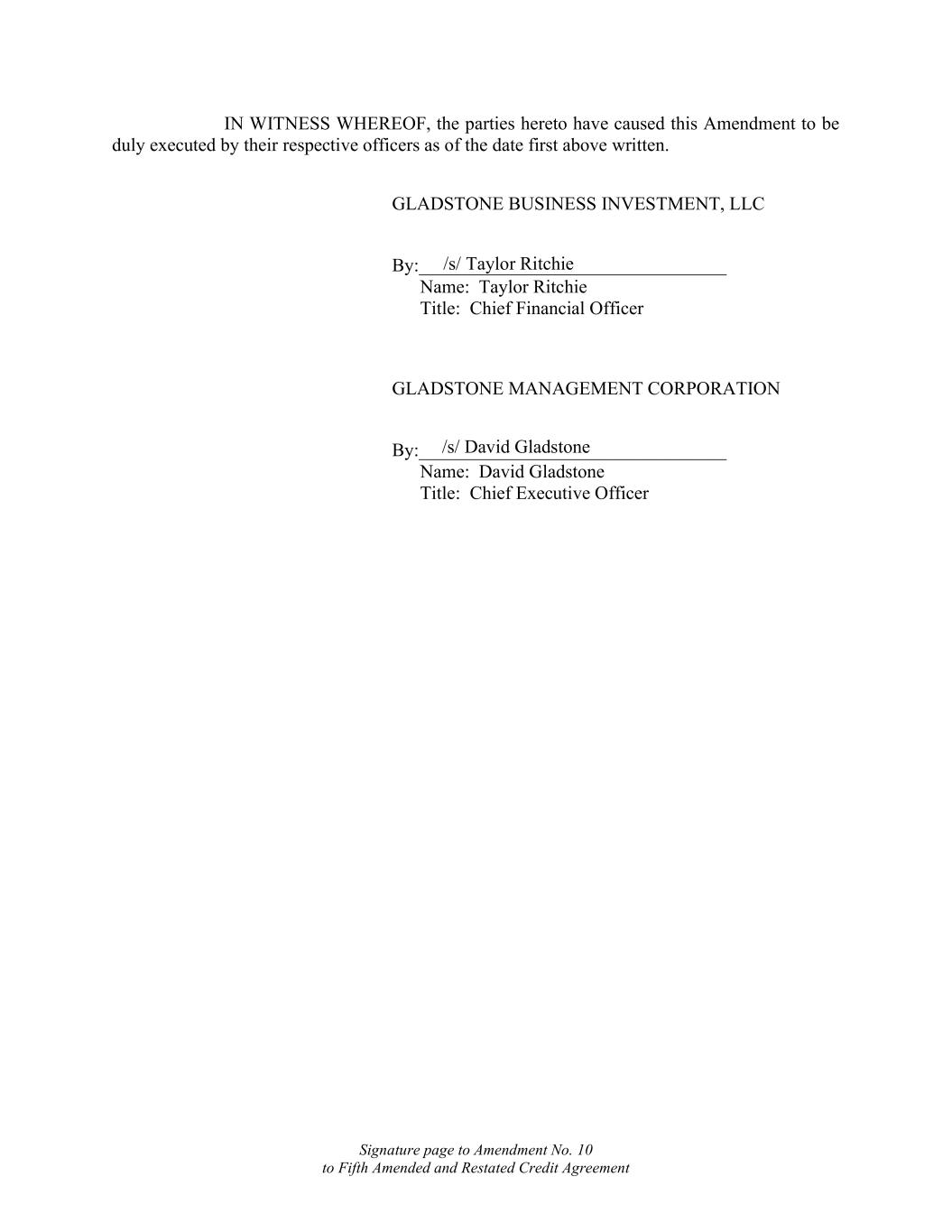 第10号至第5号修订的签名页经修订和重述的信贷协议/s/David Gladstone/s/Taylor Ritchie作为证据,本协议各方已安排在上述首次书面记录的日期由各自的高级职员正式签署本修订。Gladstone BUSINESS INVESTMENT,LLC by:_________________________________ Name:Taylor Ritchie Title:首席财务官 Gladstone Management Corporation by:______________________________ Name:David Gladstone Title:Chief Executive Officer
