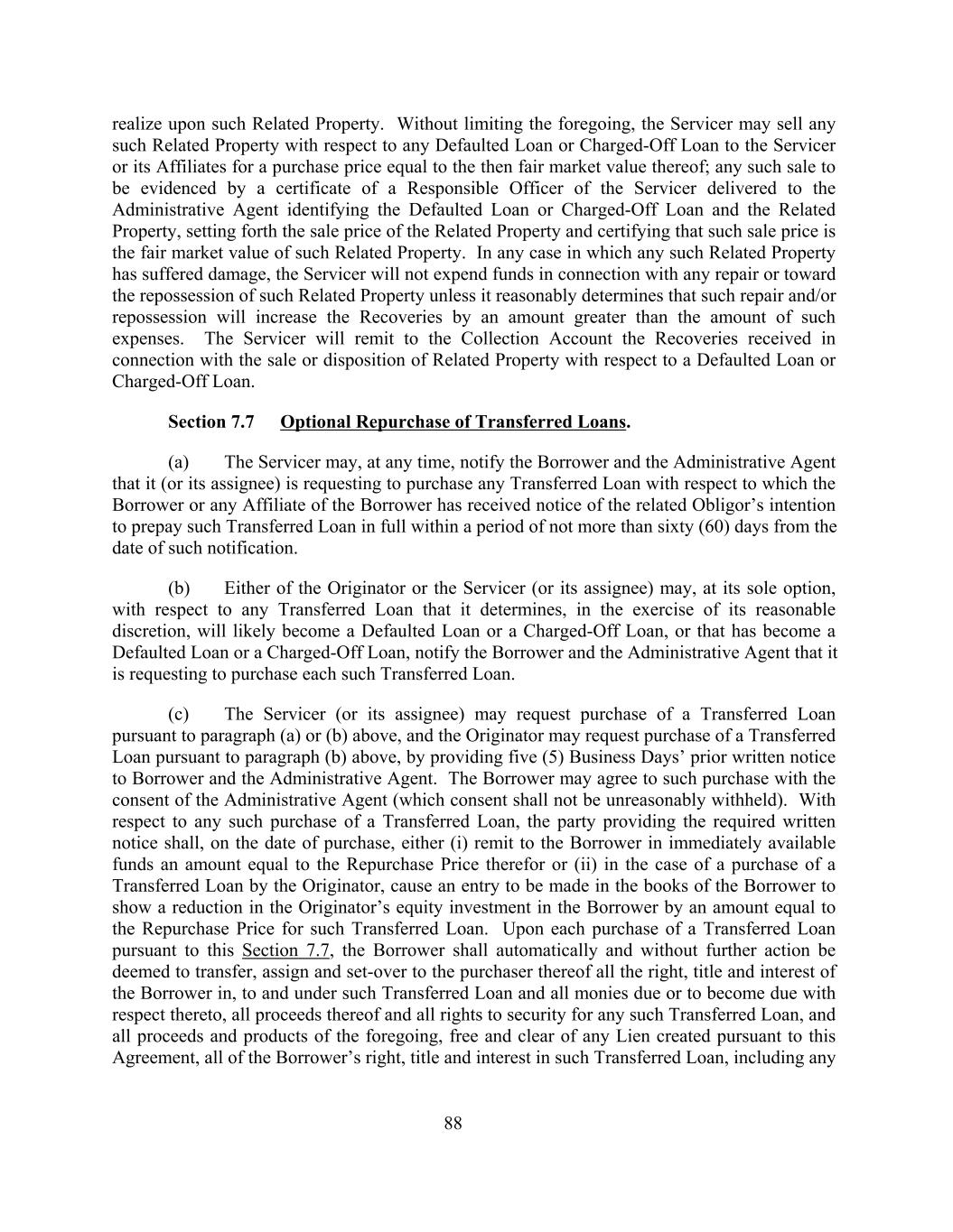 在这样的相关财产上变现。在不限制前述规定的情况下,服务人可就任何违约贷款或注销贷款向服务人或其关联公司出售任何该等相关财产,购买价格等于其当时的公平市场价值;任何该等出售须由服务人的负责人员向行政代理人交付的证明违约贷款或注销贷款及相关财产的证书证明,其中载明相关财产的销售价格,并证明该出售价格为该等相关财产的公平市场价值。在任何此类相关财产遭受损害的任何情况下,服务商将不会在任何维修或收回此类相关财产方面支出资金,除非其合理地确定此类维修和/或收回将使回收额增加的金额大于此类费用的金额。服务商将收到的与出售或处置相关财产有关的违约贷款或已核销贷款的追偿款项汇入收款账户。第7.7节转让贷款的可选回购。(a)服务人可随时通知借款人及行政代理人,其(或其受让人)正要求购买借款人或借款人的任何关联机构已收到有关债务人打算在该通知发出之日起不超过六十(60)天的期间内全额预付该转让贷款的通知所涉及的任何转让贷款。(b)发起人或服务人(或其受让人)中的任何一方可自行选择,就其在行使合理酌情权时确定将很可能成为违约贷款或已核销贷款,或已成为违约贷款或已核销贷款的任何转让贷款,通知借款人和行政代理人,其正在请求购买每一笔此类转让贷款。(c)服务人(或其受让人)可根据上文(a)或(b)段要求购买转让贷款,而发起人可根据上文(b)段要求购买转让贷款,方法是向借款人和行政代理人提供五(5)个工作日前的书面通知。经行政代理人同意(不得无理拒绝同意),借款人可以约定购买。就任何此类购买转让贷款而言,提供所需书面通知的一方应在购买之日(i)以立即可用的资金向借款人汇出相当于其回购价格的金额,或(ii)在发起人购买转让贷款的情况下,促使在借款人的账簿上作出记项,以显示发起人对借款人的股权投资减少相当于该转让贷款的回购价格的金额。在根据本条第7.7款每购买一笔转让贷款时,借款人应自动且无需采取进一步行动,视为将借款人在此种转让贷款中、在此种转让贷款中以及在此种转让贷款下的所有权利、所有权和利息以及与此有关的所有到期或将要到期的款项、其所有收益和任何此种转让贷款的所有担保权,以及上述所有收益和产品,不受根据本协议设定的任何留置权的影响,并视为将借款人的所有权利转让、转让和设定,此类转让贷款的所有权和权益,包括任何88