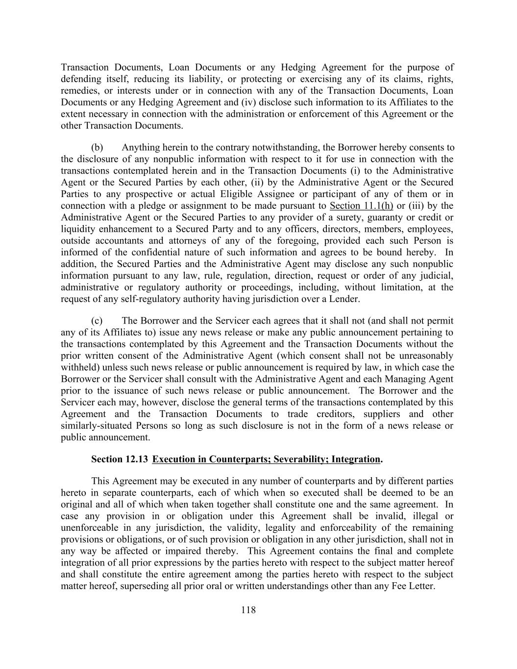 交易文件、贷款文件或任何套期保值协议,目的是为自己辩护、减轻其赔偿责任,或保护或行使其在任何交易文件、贷款文件或任何套期保值协议项下或与之相关的任何债权、权利、补救措施或利益,以及(iv)在与本协议或其他交易文件的管理或执行有关的必要范围内向其关联公司披露此类信息。(b)尽管本文中有任何相反的情况,借款人在此同意相互向行政代理人或有担保当事人披露与其有关的任何非公开信息,以用于与本文所设想的交易和交易文件(i)中的交易有关,(ii)由行政代理人或有担保方向其中任何一方的任何潜在或实际合资格受让人或参与者,或与根据第11.1(h)或(iii)条由行政代理人或有担保方向任何有担保方提供担保、担保或信用或流动性增强的任何提供者以及向上述任何一方的任何高级职员、董事、成员、雇员、外部会计师和律师作出的质押或转让有关,但前提是每一此类人被告知此类信息的机密性质并同意在此受约束。此外,有担保当事人和行政代理人可以根据任何司法、行政或管理当局或程序的任何法律、规则、条例、指示、请求或命令,包括但不限于应对贷款人具有管辖权的任何自律管理当局的请求,披露任何此类非公开信息。(c)借款人和服务商各自同意,未经行政代理人事先书面同意(不得无理拒绝同意),不得(也不得允许其任何关联机构)发布与本协议和交易文件所设想的交易有关的任何新闻稿或公告,除非法律要求发布该新闻稿或公告,在这种情况下,借款人或服务商应在发布该新闻稿或公告之前咨询行政代理人和各管理代理人。然而,借款人和服务商可各自向贸易债权人、供应商和其他类似情况的人披露本协议和交易文件所设想的交易的一般条款,只要此类披露不是以新闻稿或公告的形式。第12.13节对应方执行;可分割性;整合性。本协议可在任意数目的对应方中执行,也可由不同的对应方在不同的对应方中执行,每一方在如此执行时应被视为正本,所有这些合并在一起应构成一份相同的协议。如本协议中的任何条款或义务在任何司法管辖区无效、非法或不可执行,则其余条款或义务或该等条款或义务在任何其他司法管辖区的有效性、合法性和可执行性不因此而受到任何影响或损害。本协议包含本协议各方就本协议标的事项的所有先前表述的最终完整整合,并应构成本协议各方就本协议标的事项的全部协议,取代除任何费用信函之外的所有先前口头或书面谅解。118