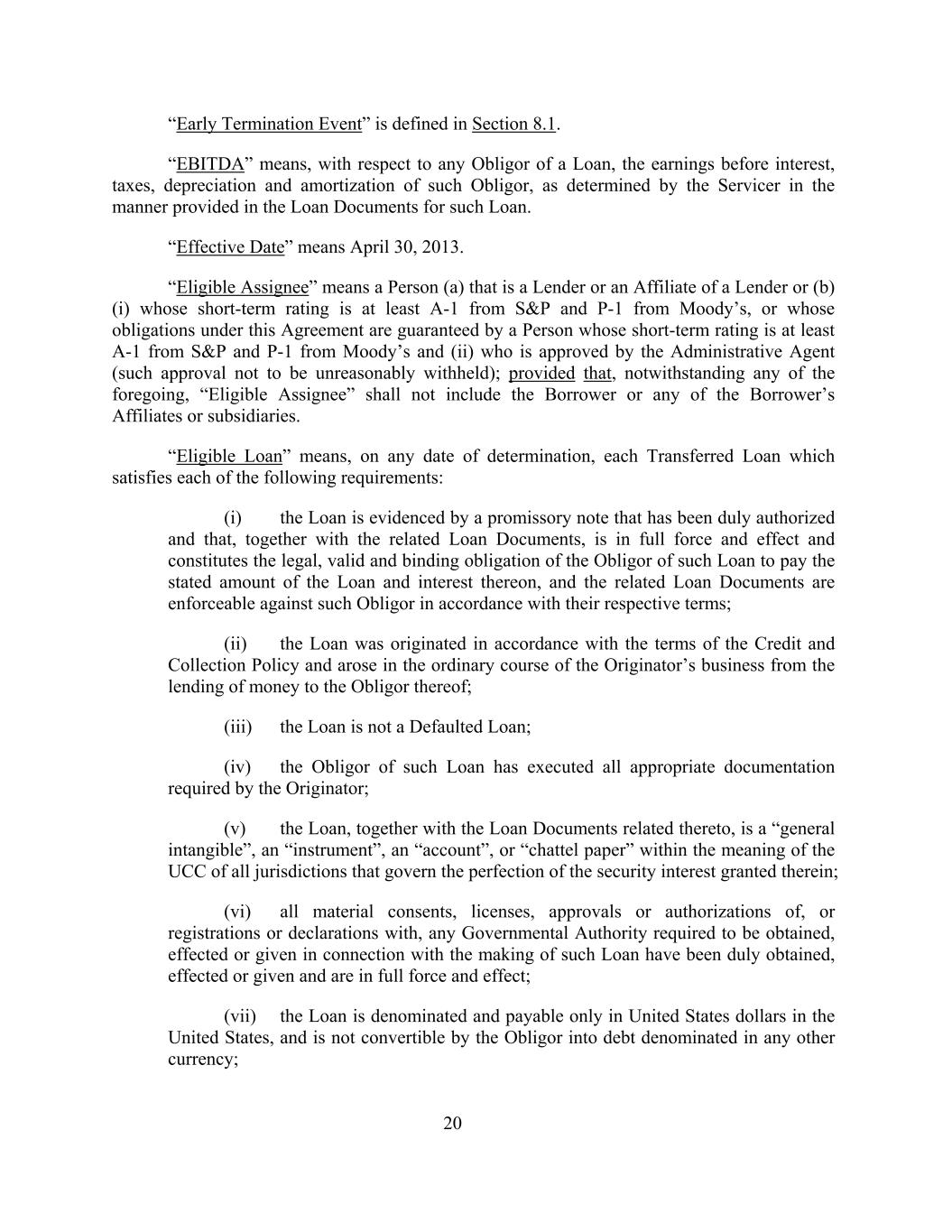 “提前终止事件”定义见第8.1节。“EBITDA”是指,就贷款的任何债务人而言,该债务人的利息、税项、折旧和摊销前收益,由服务商按照贷款文件中规定的方式为该贷款确定。“生效日期”指2013年4月30日。“合格受让人”是指(a)是贷款人或贷款人的关联公司,或(b)(i)其短期评级至少为标普的A-1和穆迪的P-1,或其在本协议下的义务由短期评级至少为标普的A-1和穆迪的P-1的人提供担保,以及(ii)经行政代理人批准(该批准不得无理拒绝)的人;但尽管有上述任何规定,“合格受让人”不应包括借款人或借款人的任何关联公司或子公司。“合资格贷款”是指,在任何确定日期,满足以下各项要求的每一笔转让贷款:(i)该贷款由已获正式授权的本票证明,且连同相关贷款文件具有充分的效力和效力,并构成该贷款的义务人支付所述贷款金额及其利息的合法、有效和具有约束力的义务,且相关贷款文件可根据其各自条款对该等债务人强制执行;(ii)该贷款是根据信贷和催收政策的条款产生的,并在发起人的正常业务过程中产生于向其债务人出借款项;(iii)该贷款不是违约贷款;(iv)该贷款的债务人已签署发起人要求的所有适当文件;(v)该贷款连同与其相关的贷款文件是“一般无形资产”、“工具”、“账户”,或管辖其中所授担保权益的完善的所有法域的UCC所指的“动产票据”;(vi)就作出该等贷款所需取得、生效或给予的任何政府当局的所有重要同意、许可、批准或授权,或向其登记或声明,均已妥为获得、生效或给予,并具有完全效力和效力;(vii)该贷款仅在美国以美元计值和支付,且不可由债务人转换为以任何其他货币计值的债务;20