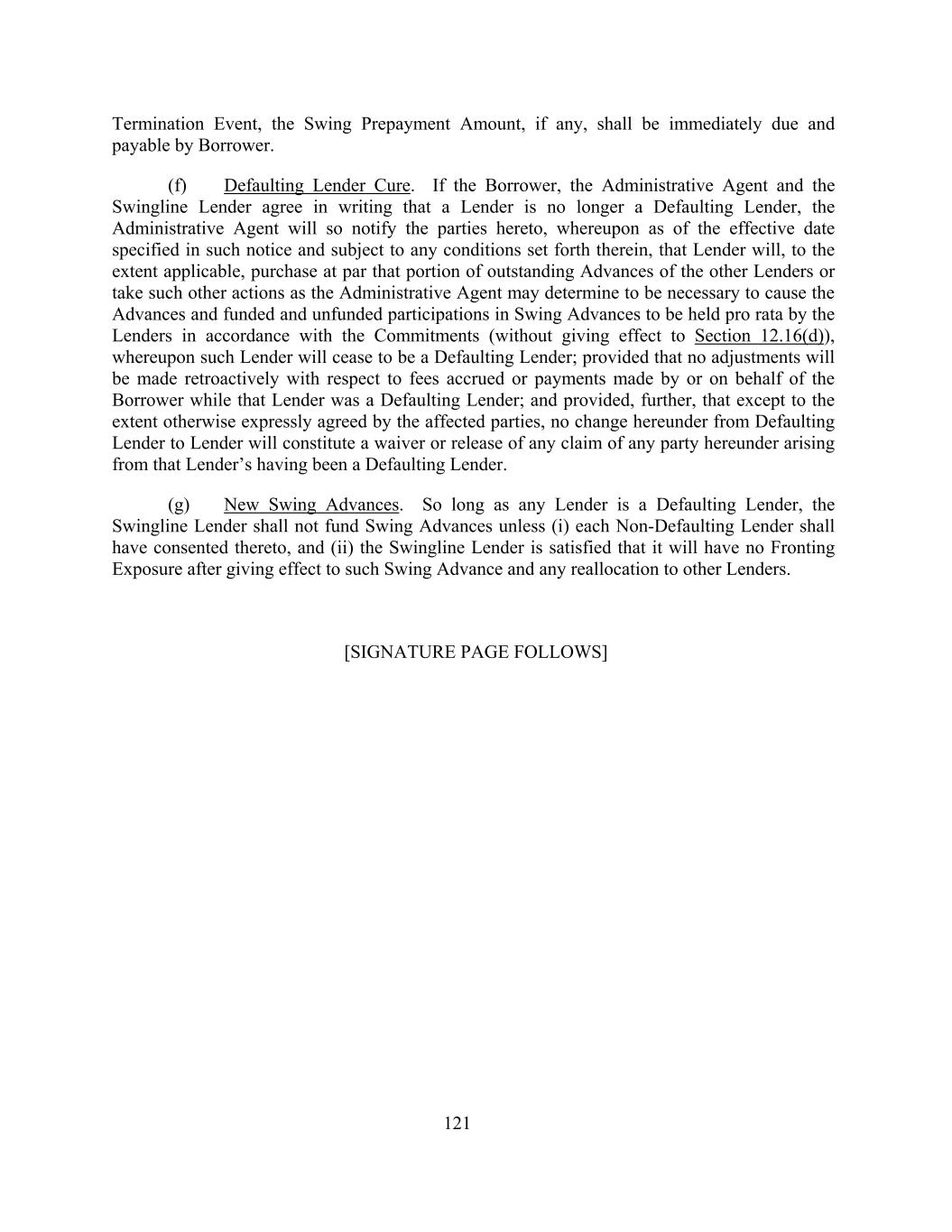 终止事件,周转预付款金额(如有)应立即到期并由借款人支付。(f)违约贷款人补救办法。如果借款人、行政代理人和Swingline贷款人书面同意贷款人不再是违约贷款人,则行政代理人将如此通知合同各方,据此,自该通知指明的生效日期起并在符合其中规定的任何条件的情况下,该贷款人将在适用的范围内,按面值购买其他贷款人的未偿还预付款部分,或采取行政代理人可能认为必要的其他行动,以促使贷款人根据承诺按比例持有预付款以及已出资和未出资参与周转预付款(不影响第12.16(d)节),据此,该贷款人将不再是违约贷款人;但在该贷款人是违约贷款人期间,不会对借款人或其代表的应计费用或付款进行追溯调整;且前提是,此外,除受影响各方另有明确约定的范围外,本协议项下从违约贷款人变为贷款人的任何变更均不构成对本协议项下任何一方因该贷款人一直是违约贷款人而产生的任何债权的放弃或解除。(g)新的周转进展。只要任何贷款人是违约贷款人,Swingline贷款人不得为周转垫款提供资金,除非(i)每个非违约贷款人均已同意,及(ii)Swingline贷款人信纳在使该周转垫款和任何重新分配给其他贷款人后,其将不会有正面风险。[签名页如下] 121