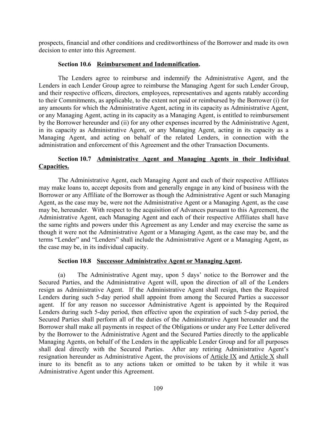 借款人的前景、财务及其他条件和信誉,并自行决定订立本协议。第10.6节偿还和赔偿。贷款人同意向行政代理人偿还和赔偿,各贷款人集团内的贷款人同意根据其承诺(如适用)按比例向该贷款人集团的管理代理人及其各自的高级职员、董事、雇员、代表和代理人偿还(i)借款人未支付或未偿还的任何金额的行政代理人(以其行政代理人身份行事)或任何管理代理人(以其管理代理人身份行事),有权根据本协议由借款人偿还和(ii)行政代理人以行政代理人身份或任何管理代理人以管理代理人身份行事并代表相关贷款人在管理和执行本协议和其他交易文件方面发生的任何其他费用。第10.7节行政代理人和以个人身份管理的代理人。行政代理人、各管理代理人及其各自的关联机构可向借款人或借款人的任何关联机构提供贷款、接受其存款,并一般从事与借款人或借款人的任何关联机构的任何业务,犹如该行政代理人或该管理代理人(视情况而定)并非本协议项下的行政代理人或管理代理人(视情况而定)。就根据本协议取得垫款而言,行政代理人、各管理代理人及其各自的附属公司在本协议项下应享有与任何贷款人相同的权利和权力,并可行使与其并非行政代理人或管理代理人(视情况而定)相同的权利和权力,而术语“贷款人”和“贷款人”应包括以个人身份的行政代理人或管理代理人(视情况而定)。第10.8节继任行政代理人或管理代理人。(a)行政代理人可在提前5日通知借款人和有担保当事人后,经全体出借人指示,由行政代理人辞去行政代理人职务。行政代理人应当离职的,则在该5天期限内的被要求出借人应当从有担保当事人中指定一名继任代理人。如果由于任何原因,在该5天期限内,所需贷款人未指定继任行政代理人,则自该5天期限届满时生效,有担保当事人应履行本协议项下行政代理人的所有职责,借款人应就借款人向行政代理人交付的债务或任何费用函项下的所有付款,有担保当事人应直接向适用的管理代理人支付,并代表适用的贷款人集团中的贷款人,并为所有目的与有担保当事人直接交易。退任行政代理人辞去本协议项下行政代理人职务后,其在本协议项下担任行政代理人期间采取或不采取的任何行动,按照第九条、第十条的规定,对其有利。109