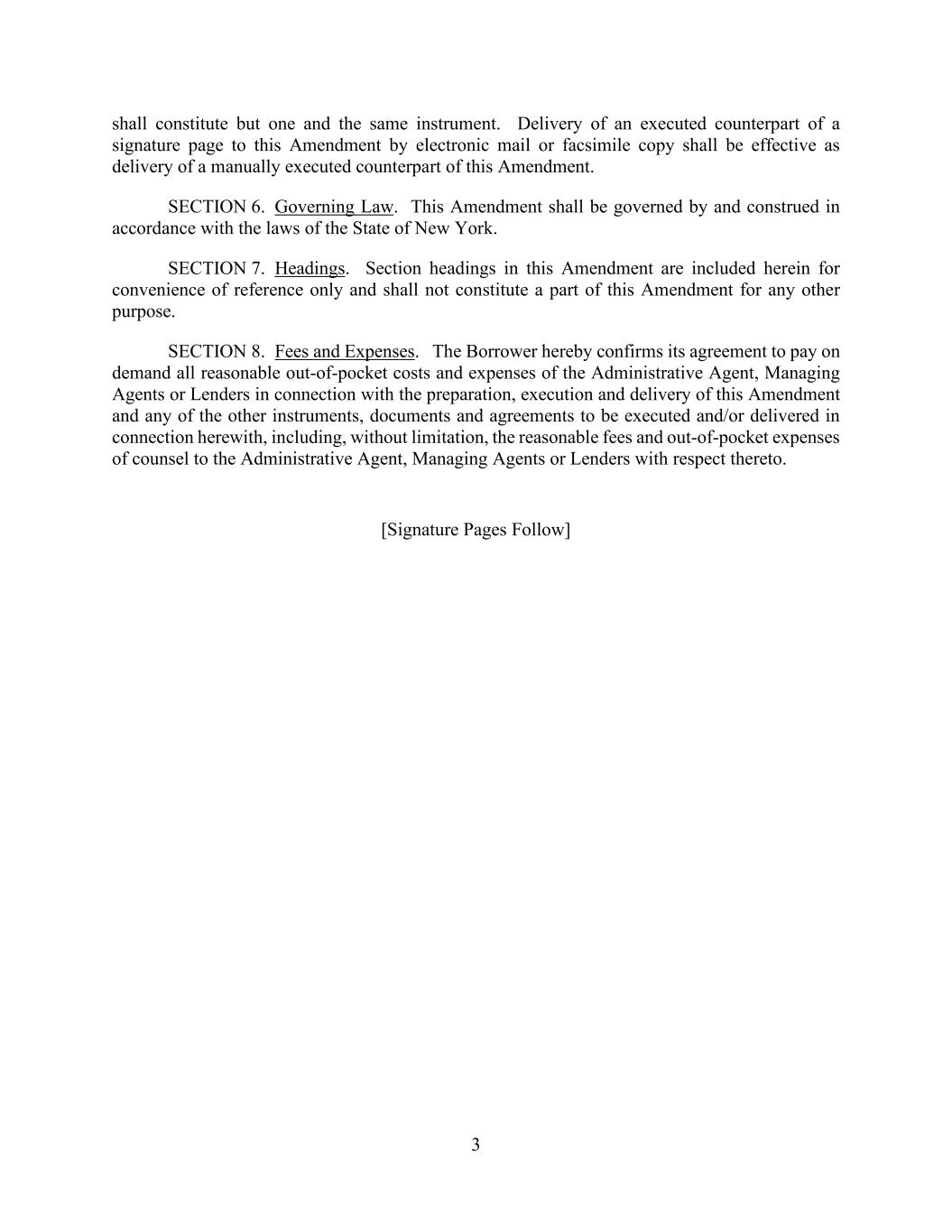 3应仅构成一份和同一份文书。以电子邮件或传真复印方式交付本修正案签字页的已执行对应方,具有交付本修正案手工执行对应方的效力。第6节。管辖法律。本修正案应受纽约州法律管辖并按其解释。第7节。标题。本修正案中的章节标题仅为便于参考而包含在此,不应构成本修正案的任何其他目的的一部分。第8节。费用支出。借款人在此确认其同意按要求支付行政代理人、管理代理人或贷款人与编制、执行和交付本修正案以及与此有关的任何其他将被执行和/或交付的文书、文件和协议有关的所有合理的自付费用和开支,包括但不限于向行政代理人、管理代理人或贷款人支付的律师的合理费用和自付费用。[签名页关注]