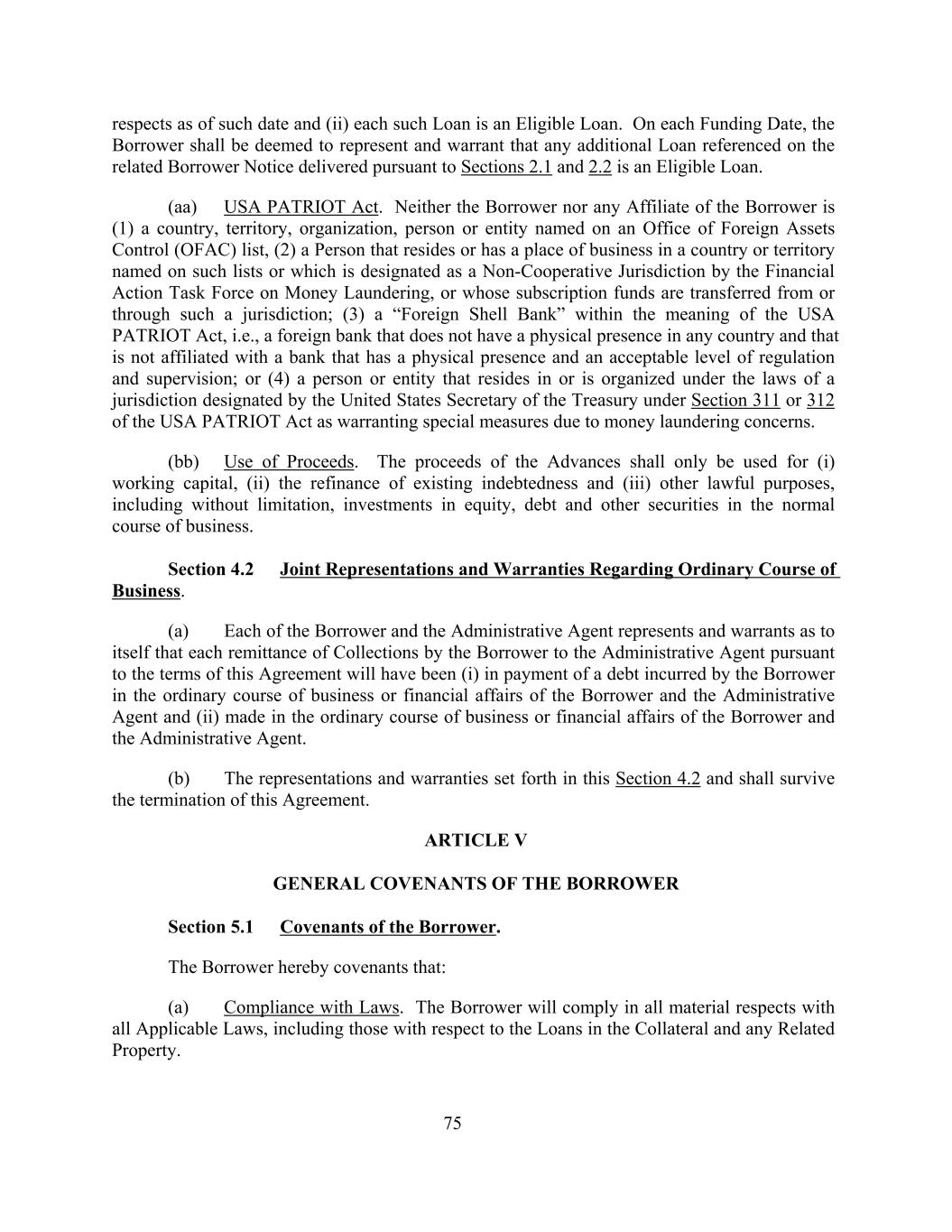截至该日期的尊重及(ii)每项该等贷款均为合资格贷款。在每个融资日期,借款人应被视为声明并保证根据第2.1和2.2节交付的相关借款人通知中提及的任何额外贷款为合格贷款。(aa)美国爱国者法案。借款人或借款人的任何附属机构都不是(1)外国资产管制办公室(OFAC)名单上所列的国家、领土、组织、个人或实体,(2)居住或在此类名单上所列的国家或领土上拥有营业地或被反洗钱金融行动特别工作组指定为非合作司法管辖区的人,或其认购资金从或通过此类司法管辖区转移;(3)《美国爱国者法案》所指的“外国贝壳银行”,即,在任何国家没有实体存在且不隶属于具有实体存在和可接受的监管和监督水平的银行的外国银行;或(4)居住在或根据美国财政部长根据《美国爱国者法》第311或312条指定的司法管辖区的法律组织的个人或实体,因洗钱问题而需要采取特别措施。(BB)所得款项用途。垫款所得款项仅用于(i)营运资金、(ii)现有债务的再融资及(iii)其他合法用途,包括但不限于在正常业务过程中对股权、债务及其他证券的投资。第4.2节关于正常业务过程的共同陈述和保证。(a)借款人和行政代理人各自对自己表示并保证,借款人依据本协议条款向行政代理人的每笔收款汇款将(i)用于支付借款人在借款人和行政代理人的正常业务过程或财务事务中发生的债务,以及(ii)在借款人和行政代理人的正常业务过程或财务事务中发生的债务。(b)本条第4.2条所列的申述及保证,并在本协议终止后继续有效。第五条借款人的一般盟约第5.1节借款人的盟约。借款人在此承诺:(a)遵守法律。借款人将在所有重大方面遵守所有适用法律,包括与抵押品中的贷款和任何相关财产有关的法律。75