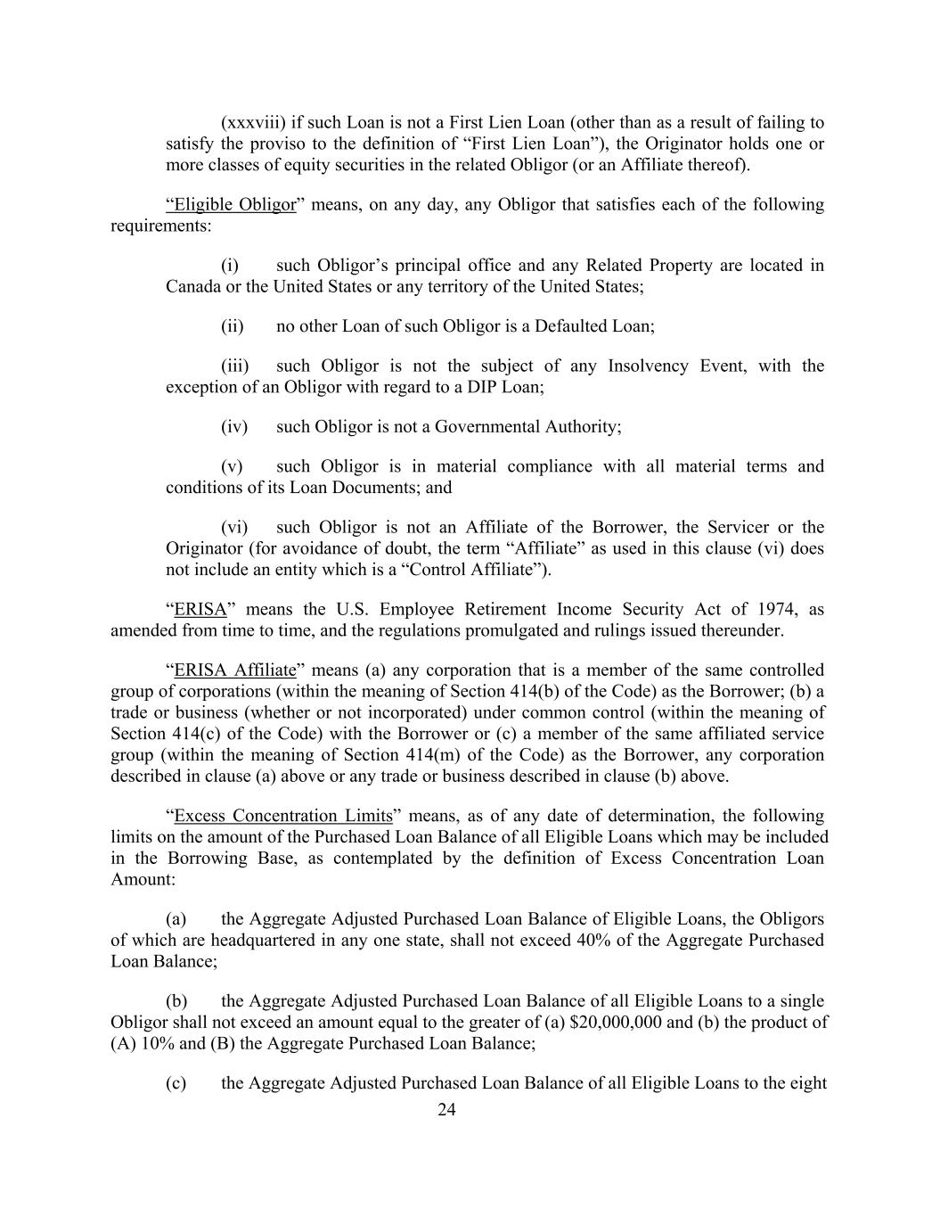 (xxxviii)如果该贷款不是第一留置权贷款(由于未能满足“第一留置权贷款”定义的但书而导致的除外),则发起人在相关债务人(或其关联公司)持有一类或多类股本证券。“合资格债务人”是指,在任何一天,满足以下各项要求的任何债务人:(i)该债务人的主要办事处和任何相关财产位于加拿大或美国或美国的任何领土;(ii)该债务人的任何其他贷款均不属于违约贷款;(iii)该债务人不是任何破产事件的主体,与DIP贷款有关的债务人除外;(iv)该债务人不是政府当局;(v)该债务人实质上遵守其贷款文件的所有重要条款和条件;(vi)该债务人不是借款人、服务人或发起人的关联公司(为免生疑问,本条款(vi)中使用的“关联公司”一词不包括属于“控制关联公司”的实体)。“ERISA”是指美国1974年《雇员退休收入保障法》,经不时修订,以及根据该法案颁布的条例和裁决。“ERISA关联公司”是指(a)作为借款人属于同一受控法团集团(在《守则》第414(b)条的含义内)的任何公司;(b)在共同控制下(在《守则》第414(c)条的含义内)与借款人或(c)作为借款人的同一关联服务集团的成员(在《守则》第414(m)条的含义内)的贸易或业务(无论是否成立)、上文(a)条所述的任何公司或上文(b)条所述的任何贸易或业务。“超额集中限额”是指,自任何确定之日起,根据超额集中贷款金额的定义,对可能计入借款基数的所有合格贷款的已购买贷款余额的以下限额:(a)合格贷款的总调整后已购买贷款余额,其债务人的总部设在任何一个州,不得超过所购贷款余额总额的40%;(b)向单一债务人提供的所有合格贷款的调整后购买贷款余额总额不得超过等于(a)20,000,000美元和(b)(a)10%和(b)所购贷款余额总额的乘积中较高者的数额;(c)向8名债务人提供的所有合格贷款的调整后购买贷款余额总额24