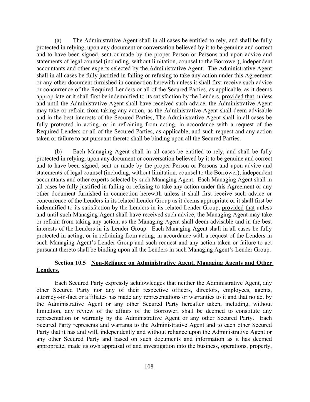 (a)行政代理人在任何情况下均有权依赖其认为真实和正确的任何文件或谈话,并在依赖方面得到充分保护,这些文件或谈话已由适当的人或个人签署、发送或作出,并根据法律顾问(包括但不限于借款人的法律顾问)、独立会计师和行政代理人选定的其他专家的建议和陈述。行政代理人在任何情况下均应有充分理由不采取或拒绝根据本协议或与本协议有关而提供的任何其他文件采取任何行动,除非其应首先收到其认为适当的所需贷款人或所有适用的有担保当事人的建议或同意,或应首先得到贷款人令其满意的赔偿,但除非和直至行政代理人收到该建议,行政代理人可采取或不采取任何行动,由于行政代理人认为可取且符合有担保当事人的最佳利益,在任何情况下,行政代理人均应在根据所需出借人或所有有担保当事人的请求(如适用)采取行动或不采取行动时得到充分保护,而该请求以及根据该请求采取或未采取行动的任何行动均应对所有有担保当事人具有约束力。(b)每名管理代理人在任何情况下均有权依赖其认为真实和正确的任何文件或谈话,并在依赖该文件或谈话时受到充分保护,该文件或谈话已由适当的人或个人签署、发送或作出,并根据法律顾问(包括但不限于借款人的大律师)、独立会计师和该管理代理人选定的其他专家的建议和陈述。各管理代理人在任何情况下均应有充分理由不采取或拒绝根据本协议或与本协议有关的任何其他文件采取任何行动,除非其应首先收到其认为适当的其相关贷款集团中的贷款人的建议或同意,或其应首先得到其相关贷款集团中的贷款人令其满意的赔偿,但除非且直至该管理代理人收到该建议,管理代理人可采取或不采取任何行动,作为管理代理人应认为可取且符合其贷款人集团中贷款人的最佳利益。在任何情况下,每一管理代理人均应在根据该管理代理人的贷款人集团中的贷款人的请求行事或不行事方面受到充分保护,而该请求以及根据该请求采取或不采取行动的任何行动均应对该管理代理人的贷款人集团中的所有贷款人具有约束力。第10.5节不依赖行政代理人、经理人和其他出借人。各有担保方明确承认,行政代理人、任何其他有担保方或其各自的任何高级管理人员、董事、雇员、代理人、实际代理人或关联机构均未向其作出任何陈述或保证,行政代理人或任何其他有担保方此后采取的任何行为,包括但不限于对借款人事务的任何审查,均不应被视为构成行政代理人或任何其他有担保方的任何陈述或保证。各担保方向行政代理人和相互担保方声明并保证,其已经并将独立且不依赖行政代理人或任何其他担保方,并根据其认为适当的文件和信息,自行对业务、经营、财产、108