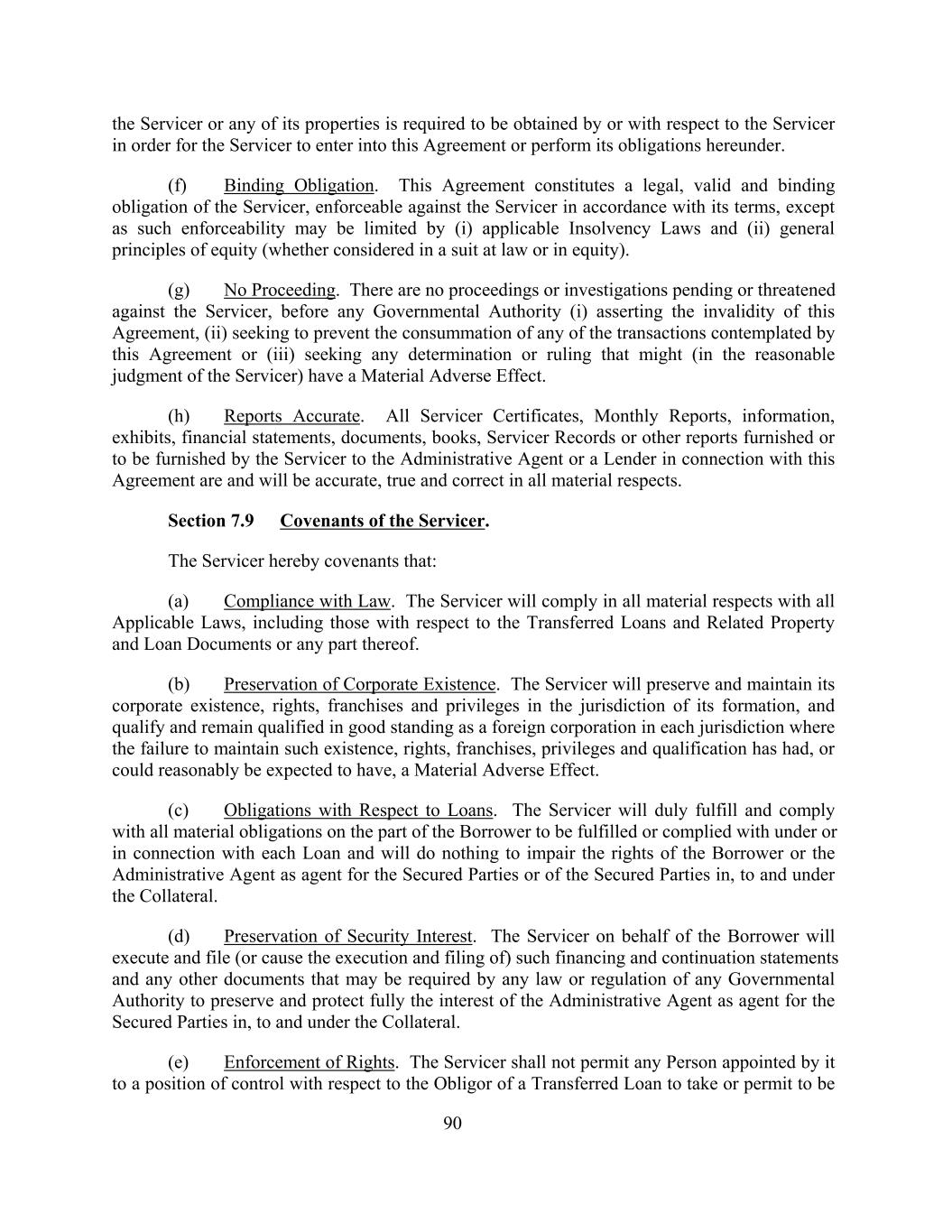 服务商或其任何财产必须由服务商获得或与服务商有关,以便服务商订立本协议或履行其在本协议下的义务。(f)具有约束力的义务。本协议构成服务商的一项合法、有效和具有约束力的义务,可根据其条款对服务商强制执行,除非此类可执行性可能受到(i)适用的破产法和(ii)一般公平原则(无论是在诉讼中还是在公平中考虑)的限制。(g)无程序。在任何政府当局(i)断言本协议无效、(ii)试图阻止本协议所设想的任何交易的完成或(iii)寻求任何可能(在服务商的合理判断中)产生重大不利影响的确定或裁决之前,没有针对服务商的未决或威胁的诉讼或调查。(h)报告准确。所有服务商就本协议向行政代理人或贷款人提供或将提供的服务商证书、月报、资料、证物、财务报表、文件、簿册、服务商记录或其他报告,在所有重大方面都是并将是准确、真实和正确的。第7.9条服务人的盟约。服务商在此承诺:(a)遵守法律。服务商将在所有重大方面遵守所有适用法律,包括与转让贷款及相关财产和贷款文件或其任何部分有关的法律。(b)维护公司存在。服务商将在其成立的司法管辖区维护和维持其公司存在、权利、特许和特权,并在未能维持此类存在、权利、特许、特权和资格已经或可以合理预期会产生重大不利影响的每个司法管辖区作为外国公司获得资格并保持其良好信誉。(c)与贷款有关的义务。服务商将适当履行和遵守借款人根据每笔贷款或与每笔贷款有关而应履行或遵守的所有重大义务,并且不会损害借款人或作为担保当事人或担保当事人的代理人的行政代理人在担保物上、对担保物上和对担保物下的权利。(d)担保权益的保全。代表借款人的服务人将执行和归档(或促使执行和归档)此类融资和延续报表以及任何政府当局的任何法律或条例可能要求的任何其他文件,以维护和充分保护作为担保方代理人的行政代理人在担保物上、到担保物上和在担保物下的利益。(e)强制执行权利。服务人不得准许由其委任的任何人士担任有关转让贷款的债务人的控制职位,以取得或准许90