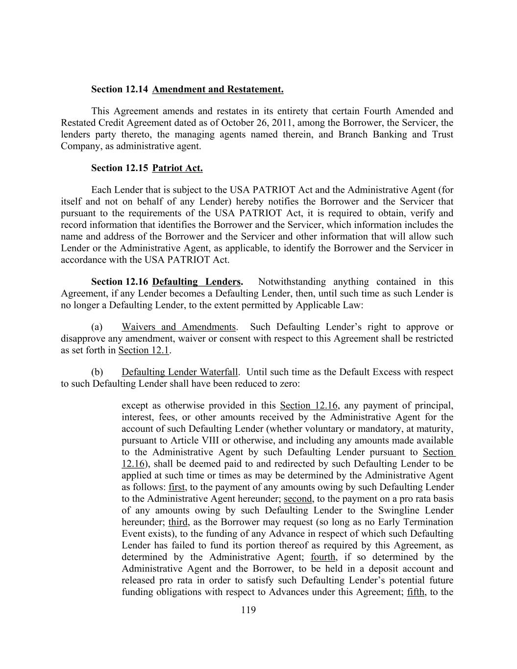 第12.14节修正和重述。本协议对作为行政代理人的借款人、服务人、贷款方、其中指定的管理代理人和分行银行信托公司之间日期为2011年10月26日的某些第四次经修订和重述的信贷协议进行了全部修订和重申。第12.15节《爱国者法案》。受《美国爱国者法》约束的每个贷款人和行政代理人(为自己而不是代表任何贷款人)特此通知借款人和服务人,根据《美国爱国者法》的要求,它需要获得、核实和记录识别借款人和服务人的信息,这些信息包括借款人和服务人的姓名和地址以及允许此类贷款人或行政代理人(如适用)根据《美国爱国者法》识别借款人和服务人的其他信息。第12.16节违约贷款人。尽管本协议中有任何规定,如果任何贷款人成为违约贷款人,那么,在该贷款人不再是违约贷款人之前,在适用法律允许的范围内:(a)豁免和修正。这类违约贷款人批准或不批准与本协议有关的任何修改、放弃或同意的权利应受到第12.1节规定的限制。(b)违约贷款人瀑布。直至有关该违约贷款人的违约超额已减至零:除本条第12.16款另有规定外,行政代理人为该违约贷款人的账户收到的任何本金、利息、费用或其他款项(不论是自愿或强制性的、到期时、根据第八条或其他方式,包括该违约贷款人根据第12.16款向行政代理人提供的任何款项),应被视为已支付给该违约贷款人并由其重新定向,以在行政代理人可能确定的以下时间或时间申请:第一,支付该违约贷款人根据本协议欠行政代理人的任何款项;第二,按比例支付该违约贷款人根据本协议欠Swingline贷款人的任何款项;第三,根据借款人的要求(只要不存在提前终止事件),为该违约贷款人未能按行政代理人确定的本协议要求为其部分垫款提供资金的任何垫款提供资金;第四,如果行政代理人和借款人如此确定,则应存放在存款账户中并按比例释放,以满足该违约贷款人未来可能就本协议项下的垫款承担的资金义务;第五,至119