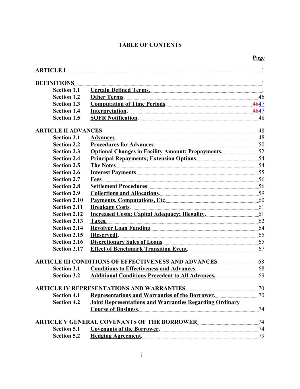 目录页第一条1定义1第1.1节某些定义的术语。1第1.2节其他条款。46第1.3节时间周期的计算。4647第1.4节释义。4647第1.5节SOFR通知。48第二条先行48款2.1款先行。48第2.2节垫款程序。50第2.3节融资金额的可选变动;预付款项。52第2.4节还本;展期选择。54第2.5节说明。54第2.6节利息支付。55第2.7节费用。56第2.8节结算程序。56第2.9节收款和拨款。59第2.10款付款、计算等60第2.11款破碎费。61第2.12节增加成本;资本充足;违法。61第2.13节税收。62第2.14节循环贷款资金。64第2.15节[保留]。65第2.16节酌情出售贷款。65第2.17节基准转换事件的效果。67第三条生效条件和推进68第3.1节生效条件和推进。68第3.2节所有垫款的先决条件附加条件。69第四条陈述和保证70第4.1节借款人的陈述和保证。70第4.2节关于正常业务过程的联合陈述和保证。74第五条借款人的一般盟约74第5.1节借款人的盟约。74第5.2节套期保值协议。79 i