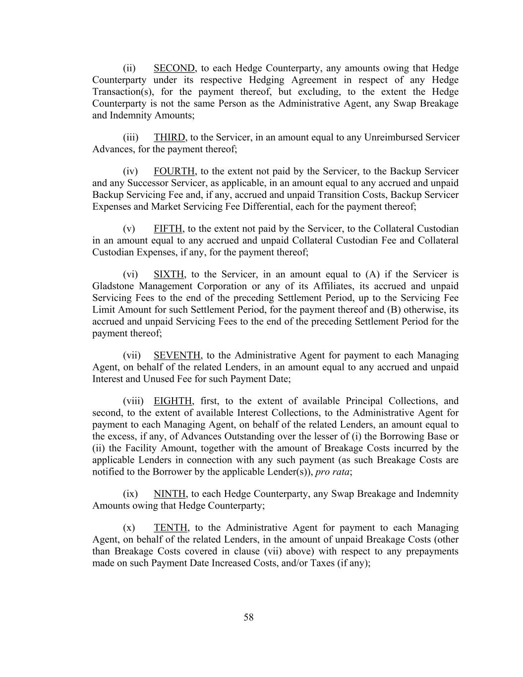(ii)第二,就任何对冲交易向每名对冲对手方支付根据其各自的对冲协议所欠该对冲对手方的任何款项,以支付该款项,但在对冲对手方与行政代理人不是同一人的情况下,不包括任何掉期违约和赔偿金额;(iii)第三,向服务商支付相当于任何未偿还的服务商预付款的金额,以支付该款项;(iv)第四,在服务商未支付的范围内,向备用服务商和任何后续服务商(如适用)支付,金额相当于任何应计和未支付的备用服务费,以及(如有)应计和未支付的过渡费用、备用服务商费用和市场服务费差额,每一项均用于支付;(v)在服务商未支付的范围内,第五次支付给抵押托管人,金额等于任何应计和未支付的抵押托管费和抵押托管费用(如有),用于支付;(vi)第六次,支付给服务商,金额等于(a)如果服务商是Gladstone Management Corporation或其任何关联公司,其截至前一结算期结束时的应计未付服务费,最高可达该结算期的服务费限额金额,以供支付;及(b)否则,其截至前一结算期结束时的应计未付服务费,以供支付;(vii)第七,代相关贷款人向行政代理人支付,金额相当于该支付日期的任何应计未付利息和未使用费用;(viii)第八,第一,以可用本金收取为限,第二,在可收取利息的范围内,向行政代理人代相关贷款人向每一管理代理人支付相当于(i)借款基数或(ii)融资金额中较低者的未偿预付款的超出部分(如有)的金额,以及适用的贷款人就任何此类付款(因为此类断裂成本由适用的贷款人(s)按比例通知借款人)而产生的断裂成本金额;(ix)向每一对冲对手方支付第九笔,拖欠该对冲对手方的任何掉期断裂和赔偿金额;(x)第十笔,就在该付款日期作出的任何预付款项,向行政代理人支付未付的破碎费用(上文第(vii)条所涵盖的破碎费用除外)的金额,以代表相关贷款人向各管理代理人支付增加的费用,及/或税款(如有);58