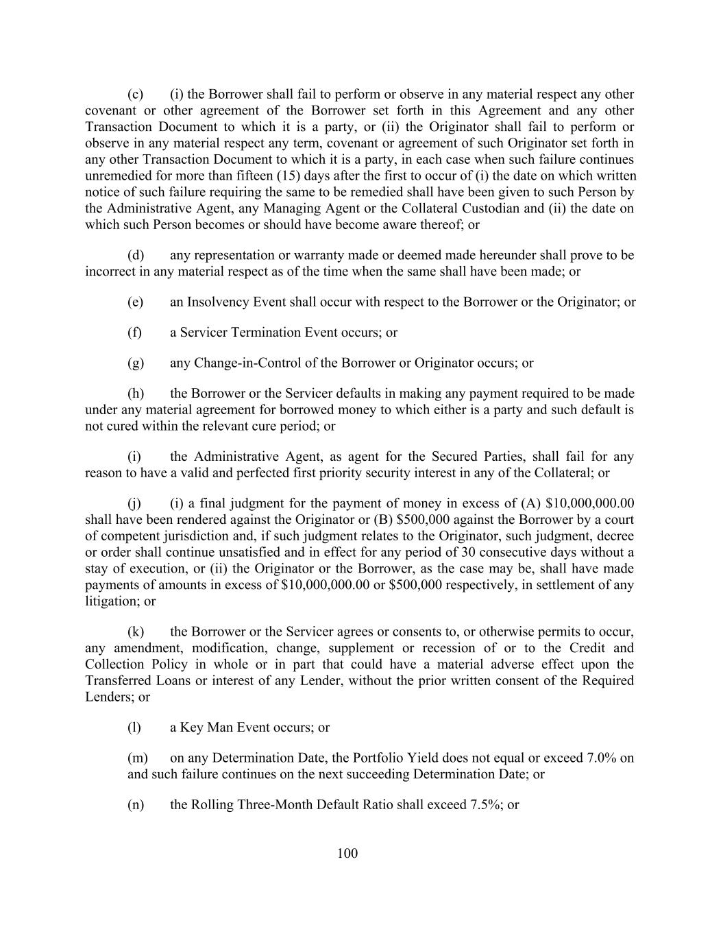 (c)(i)借款人不得在任何重要方面履行或遵守本协议及其为其一方的任何其他交易文件所载的借款人的任何其他契诺或其他协议,或(ii)发起人不得在任何重要方面履行或遵守其为一方的任何其他交易文件所载的该发起人的任何条款、契诺或协议,在每一情况下,如该等失责在(i)行政代理人已向该人发出要求就该失责作出补救的书面通知之日起首次发生后超过十五(15)天仍未获补救,任何管理代理人或抵押品托管人(ii)该人成为或应已知悉的日期;或(d)根据本协议作出或当作作出的任何陈述或保证,自作出该等陈述或保证时起,须证明在任何重大方面不正确;或(e)就借款人或发起人发生破产事件;或(f)发生服务人终止事件;或(g)发生借款人或发起人的任何控制权变更;或(h)借款人或服务人拖欠根据任何重大协议须作出的任何付款对于任何一方为当事人且该违约未在相关补救期内得到纠正的借款;或(i)行政代理人作为有担保当事人的代理人,不得因任何原因未能在任何担保物上拥有有效和完善的第一优先担保权益;或(j)(i)有管辖权的法院应已就支付超过(a)10,000,000.00美元的款项向发起人或(b)500,000美元向借款人作出最终判决,如果该判决与发起人有关,则该判决,判令或命令须持续不获满足及在任何连续30天内有效而不会中止执行,或(ii)发起人或借款人(视属何情况而定)须已分别支付超过10,000,000.00美元或500,000美元的款项,以解决任何诉讼;或(k)借款人或服务人同意或同意,或以其他方式准许发生任何修订、修改、更改,未经所需贷款人事先书面同意,可能对任何贷款人的已转让贷款或利息产生重大不利影响的全部或部分信贷和催收政策的补充或衰退;或(l)发生关键人物事件;或(m)在任何确定日期,投资组合收益率不等于或超过7.0%,且该失败在下一个确定日期继续;或(n)滚动三个月违约率应超过7.5%;或100