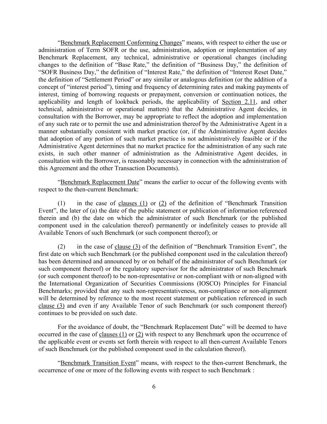 “基准替换符合性变更”是指,就Term SOFR的使用或管理或任何基准替换的使用、管理、采用或实施而言,任何技术、行政或操作变更(包括“基准利率”定义的变更、“营业日”定义的变更、“SOFR营业日”定义的变更、“利率”定义的变更、“利息重置日”定义的变更、行政代理人与借款人协商决定的“结算期”定义或任何类似或类似定义(或增加“利息期”概念)、确定利率和支付利息的时间和频率、借款请求或提前还款、转换或延续通知的时间、回溯期的适用性和长度、第2.11节的适用性以及其他技术、行政或操作事项),可适当反映任何该等费率的采用和实施情况,或允许行政代理人以与市场惯例基本一致的方式使用和管理该等费率(或,如果行政代理人认为采用该等市场惯例的任何部分在行政上不可行,或如果行政代理人确定不存在管理任何该等费率的市场惯例,则以行政代理人与借款人协商决定的其他管理方式,与本协议和其他交易文件的管理有关是合理必要的)。“基准更换日期”是指以下事件相对于当时的基准发生的较早时间:(1)在“基准转换事件”定义第(1)或(2)条的情况下,(a)公开声明或公布其中所指信息的日期和(b)该基准(或计算该基准时使用的已公布部分)的管理人永久或无限期停止提供该基准(或其此类部分)的所有可用期限的日期,两者中较后者为准;或(2)在“基准过渡事件”定义第(3)条的情况下,此类基准(或其计算中使用的已公布组成部分)由此类基准(或其此类组成部分)的管理人或其代表确定并宣布为不具有代表性或不符合或不符合国际证监会组织(IOSCO)金融基准原则的监管主管的第一个日期;但任何此类不代表性,不遵守或不一致将通过参考第(3)条中提及的最新声明或出版物来确定,即使在该日期继续提供此类基准(或其此类组成部分)的任何可用期限。为免生疑问,在第(1)或(2)条有关任何基准的情况下,一旦发生适用的事件或其中所述的有关该基准的所有当时可用期限(或计算该基准时使用的已公布组成部分)的事件,“基准更换日期”将被视为已经发生。“基准过渡事件”是指,就当时的基准而言,就该基准而言,发生以下一项或多项事件:6