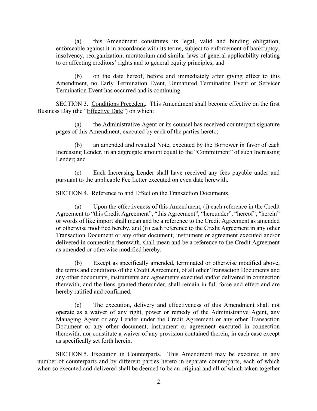 2(a)本修订构成其法律、有效和具有约束力的义务,可根据其条款对其强制执行,但须遵守破产、无力偿债、重组、暂停执行以及与或影响债权人权利和一般股权原则的普遍适用的类似法律的强制执行;以及(b)在本修订生效之日、本修订生效之前和之后,没有发生提前终止事件、未到期终止事件或服务商终止事件,并且仍在继续。第3节。先决条件。本修订自以下日期的第一个营业日(“生效日期”)起生效:(a)行政代理人或其律师收到本修订的对应签名页,由本协议各方签署;(b)经修订和重述的票据,由借款人以有利于每个增加贷款人的方式签署,总额等于该增加贷款人的“承诺”;以及(c)每个增加贷款人应已收到根据本协议偶数日期签署的适用费用函应付的任何费用。第4节。交易文件的提述及效力。(a)在本修订生效后,(i)信贷协议中每项提述“本信贷协议”、“本协议”、“本协议”、“本协议”、“本协议”、“本协议”或类似含义的词语,均指并为经修订或以其他方式修改的信贷协议的提述,及(ii)任何其他交易文件或与此有关的任何其他已签立和/或交付的文件、文书或协议中每项提述信贷协议,均指并为经修订或以其他方式修改的信贷协议的提述。(b)除上文特别修订、终止或以其他方式修改外,信贷协议、所有其他交易单证以及与此有关而签立和/或交付的任何其他单证、票据和协议的条款和条件,以及根据该协议授予的留置权,应保持完全有效,并在此予以批准和确认。(c)本修订的执行、交付和有效性不应作为对行政代理人、任何管理代理人或任何贷款人根据信贷协议或任何其他交易文件或与此有关而签立的任何其他文件、文书或协议的任何权利、权力或补救措施的放弃,也不构成对其中所载任何规定的放弃,在每种情况下,除非本条款具体规定。第5节。在对口部门执行。本修正案可以在任意数目的对应方中执行,也可以由不同的当事人在不同的对应方中执行,每一项经如此执行和交付后均应视为正本,且全部合并