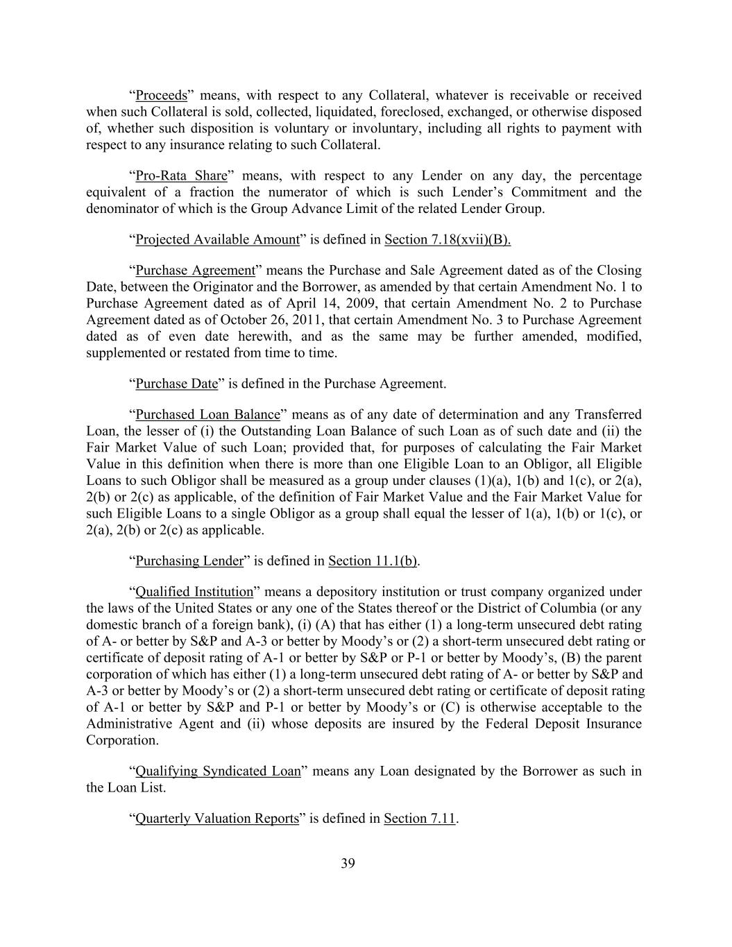 “收益”是指,就任何抵押品而言,在此类抵押品被出售、收取、清算、取消抵押品赎回权、交换或以其他方式处置时,无论此类处置是自愿的还是非自愿的,应收或收到的任何款项,包括与此类抵押品有关的任何保险的所有付款权利。“按比例份额”是指,就任何贷款人而言,在任何一天,其分子为该贷款人承诺且其分母为相关贷款人集团的集团垫付限额的零头的百分比等值。“预计可用金额”在第7.18(xvii)(b)节中定义。「购买协议」指发起人与借款人于截止日期订立的买卖协议,经日期为2009年4月14日的购买协议的第1号修订、日期为2011年10月26日的购买协议的第2号修订、日期为偶数日期的购买协议的第3号修订,并可能不时进一步修订、修订、补充或重述。购买协议中定义了“购买日期”。“所购贷款余额”是指截至任何确定日期和任何转让的贷款,(i)截至该日期该贷款的未偿还贷款余额和(ii)该贷款的公平市场价值两者中的较低者;但为计算本定义中的公平市场价值,当有多于一笔合格贷款提供给债务人时,向该债务人提供的所有合格贷款应按照第(1)(a)、1(b)和1(c)条或适用的2(a)、2(b)或2(c)条作为一组计量,公平市场价值的定义和作为一个集团向单一债务人提供的此类合格贷款的公平市场价值应等于1(a)、1(b)或1(c),或2(a)、2(b)或2(c)中的较低者(如适用)。第11.1(b)节对“采购贷款人”进行了定义。“合格机构”是指根据美国或其任何一国法律或哥伦比亚特区法律组建的存款机构或信托公司(或外国银行的任何国内分支机构),(i)(a)具有(1)标普和穆迪A-3或更高的长期无担保债务评级或(2)短期无担保债务评级A-1或更高或穆迪P-1或更高的短期无担保债务评级或存单评级,(b)其母公司的(1)长期无担保债务评级为A-或更好的由标普和A-3或更好的由穆迪,或(2)短期无担保债务评级或存单评级为A-1或更好的由标普和P-1或更好的由穆迪,或(c)在其他方面为行政代理人所接受,且(ii)其存款由联邦存款保险公司投保。“合格银团贷款”是指借款人在贷款清单中指定的任何贷款。“季度估值报告”在第7.11节中定义。39