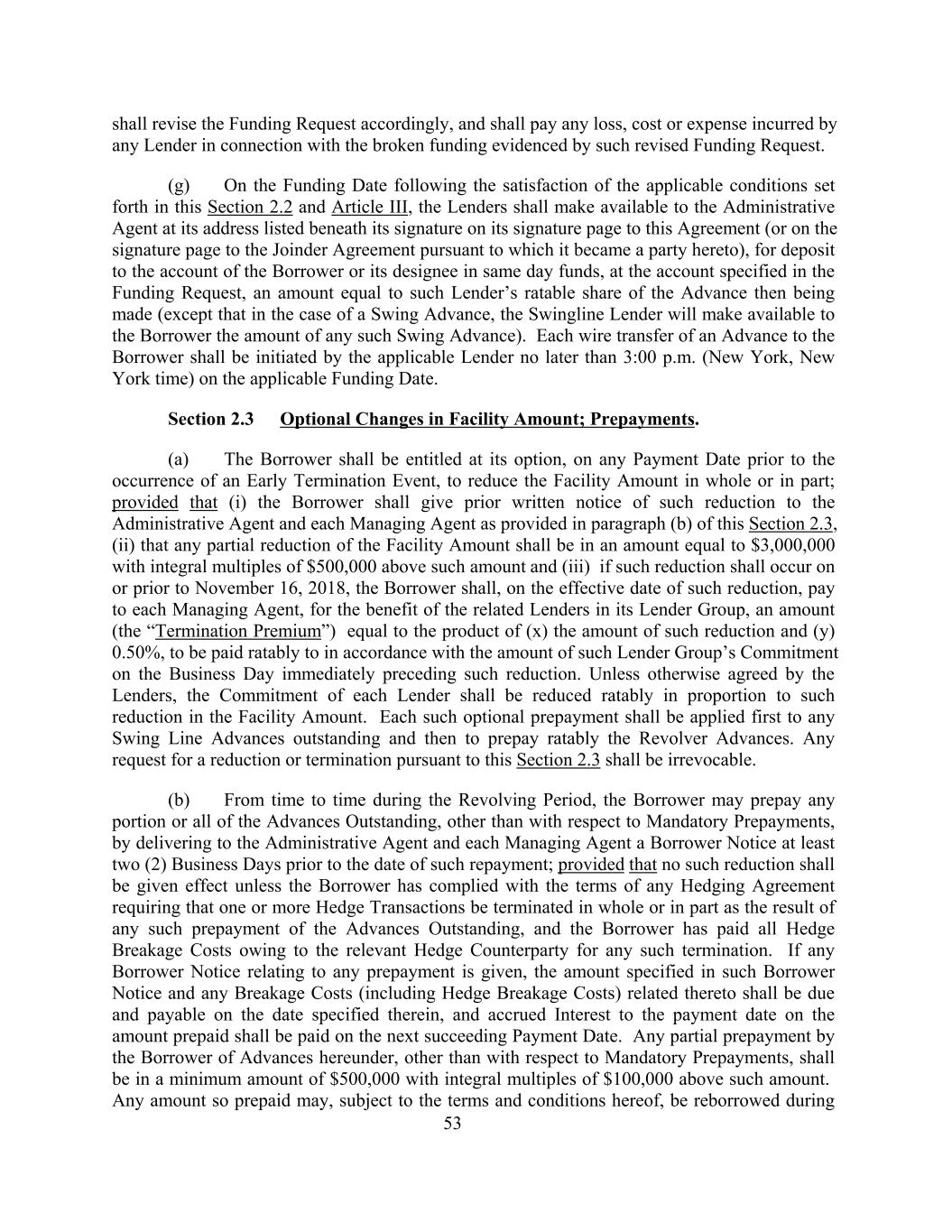 应相应修改资金请求,并应支付任何贷款人因该修改资金请求所证明的资金中断而产生的任何损失、成本或费用。(g)在满足本条第2.2款和第三条规定的适用条件后的供资日,放款人应按其在本协议签字页上(或根据其成为本协议一方的《合并协议》签字页上)签字下方所列的地址向行政代理人提供资金,以便存入借款人或其指定人当日账户的资金,存放在资金请求书中指明的账户,相当于该贷款人当时在垫款中的应课税份额的金额(除非在周转垫款的情况下,周转贷款机构将向借款人提供任何此类周转垫款的金额)。向借款人的每笔预付款电汇应由适用的贷款人不迟于适用的融资日期下午3:00(纽约、纽约时间)发起。第2.3节融资金额的可选变动;预付款项。(a)借款人有权在提前终止事件发生前的任何付款日期选择全部或部分减少融资金额;但(i)借款人须按本条第2.3款(b)项的规定,事先向行政代理人及每名管理代理人发出有关减少的书面通知,(ii)任何部分削减融资金额的金额须等于3,000,000美元,并须高于该金额500,000美元的整数倍;及(iii)如该等削减发生在2018年11月16日或之前,借款人须于该等削减的生效日期,为其贷款人集团中的相关贷款人的利益,向每名管理代理人支付一笔金额(“终止溢价”),相等于(x)该等削减金额与(y)0.50%的乘积,按照该贷款人集团在紧接该等减持前一个营业日的承诺金额按比例支付给。除出借人另有约定外,各出借人的承诺额应按融资额度减少的比例按比例减少。每笔此类可选预付款应首先适用于任何未偿还的周转额度预付款,然后按比例预付左轮手枪预付款。根据本条第2.3款提出的任何减少或终止请求均不可撤销。(b)在循环期内,借款人可不时预付任何部分或全部未偿还的垫款,但强制性预付款项除外,通过在此类还款日期前至少两(2)个工作日向行政代理人和每个管理代理人交付借款人通知;但除非借款人已遵守任何套期保值协议的条款,要求一项或多项套期保值交易因任何此类预付未偿预付款而全部或部分终止,且借款人已就任何此类终止支付了相关对冲对手方欠下的所有对冲打破成本,否则不得实施此类减少。如发出任何与任何预付款项有关的借款人通知,则该借款人通知所指明的金额及与之有关的任何破碎费用(包括对冲破碎费用)须于该通知所指明的日期到期应付,而预付款项至付款日期的应计利息须于下一个付款日期支付。除强制性预付款项外,借款人根据本协议预付的任何部分预付款的最低金额应为500,000美元,高于该金额的整数倍为100,000美元。任何如此预付的金额,在符合本协议条款和条件的情况下,可在53年期间再借