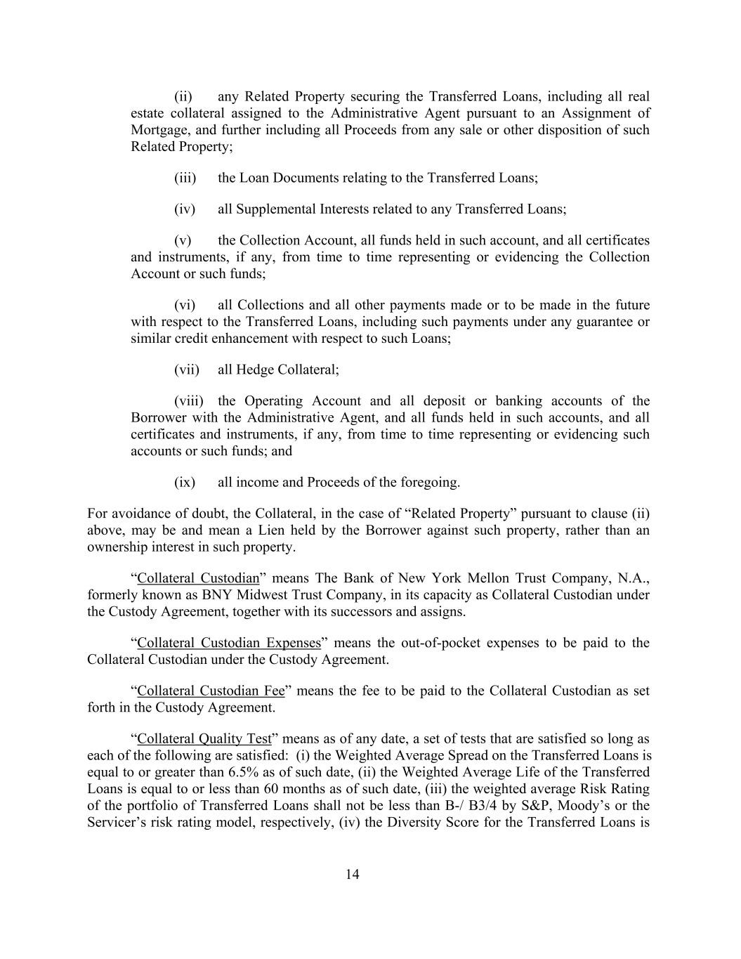 (ii)为转让贷款作担保的任何有关财产,包括依据按揭转让而转让予行政代理人的所有不动产抵押品,并进一步包括出售或以其他方式处置该等有关财产的所有收益;(iii)与转让贷款有关的贷款文件;(iv)与任何转让贷款有关的所有补充权益;(v)收款账户、该账户所持有的所有资金,以及所有凭证和票据(如有),不时代表或证明收款账户或该等资金;(vi)就所转让的贷款作出的所有收款和今后将作出的所有其他付款,包括根据与该等贷款有关的任何担保或类似信用增级作出的此类付款;(vii)所有对冲抵押品;(viii)借款人在行政代理人处的经营账户和所有存款或银行账户,以及在该等账户中持有的所有资金,以及所有凭证和票据(如有),不时代表或证明该等帐户或该等资金;及(ix)上述的所有收入及收益。为免生疑问,在根据上文第(ii)款所指的“相关财产”的情况下,担保物可能是并指借款人对此类财产持有的留置权,而不是此类财产的所有权权益。「抵押托管人」指纽约梅隆银行信托公司,N.A.,前身为BNY Midwest Trust Company,以其作为托管协议项下抵押托管人的身份,连同其继任者及受让人。“抵押保管费用”是指根据托管协议向抵押保管人支付的自付费用。“抵押物托管费”是指托管协议中规定的应支付给抵押物托管人的费用。“抵押品质量测试”是指截至任何日期,只要满足以下各项,即满足的一组测试:(i)截至该日期,已转让贷款的加权平均利差等于或高于6.5%,(ii)截至该日期,已转让贷款的加权平均年限等于或小于60个月,(iii)经标普、穆迪或服务商风险评级模型对已转让贷款组合的加权平均风险评级分别不低于B-/B3/4,(iv)转让贷款的多样性得分为14