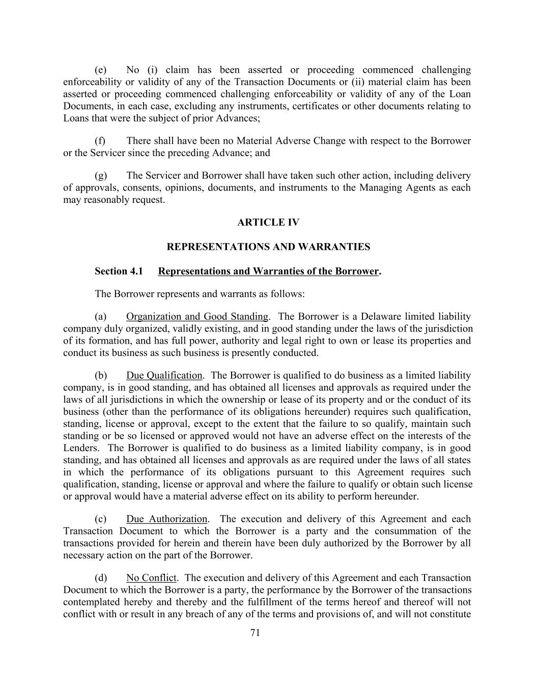 (e)没有(i)提出申索或展开程序质疑任何交易文件的可执行性或有效性,或(ii)提出重大申索或展开程序质疑任何贷款文件的可执行性或有效性,在每种情况下,均不包括先前垫款标的与贷款有关的任何文书、证书或其他文件;(f)自先前垫款以来,借款人或服务人不应发生重大不利变化;(g)服务人和借款人应已采取此类其他行动,包括交付批准、同意、意见,文件,并根据各自的合理要求向管理代理提供文书。第四条申述和保证第4.1节借款人的申述和保证。借款人的陈述和保证如下:(a)组织和良好信誉。借款人是一家特拉华州有限责任公司,正式组建、有效存续,并在其组建的司法管辖区法律下具有良好的信誉,拥有拥有或租赁其财产并按目前开展的业务开展业务的充分权力、权限和合法权利。(b)适当资格。借款人有资格作为有限责任公司开展业务,信誉良好,并已根据其财产的所有权或租赁和/或其业务的开展(履行其在本协议项下的义务除外)所要求的所有法域的法律获得所有许可和批准,除非未能获得此种资格、维持此种地位或获得此种许可或批准不会对贷款人的利益产生不利影响。借款人有资格作为有限责任公司开展业务,信誉良好,并已获得所有州法律规定的所有许可和批准,在这些州履行其根据本协议承担的义务需要此类资格、地位、许可或批准,如果未能获得资格或获得此类许可或批准将对其根据本协议履行的能力产生重大不利影响。(c)适当授权。本协议和借款人作为一方当事人的每份交易文件的执行和交付以及本协议和本协议中规定的交易的完成均已得到借款人通过借款人方面的一切必要行动的正式授权。(d)没有冲突。本协议及借款人作为一方当事人的每份交易文件的执行和交付、借款人对本协议及由此设想的交易的履行以及本协议及其条款的履行不会与本协议的任何条款和规定发生冲突或导致任何违反,也不构成71