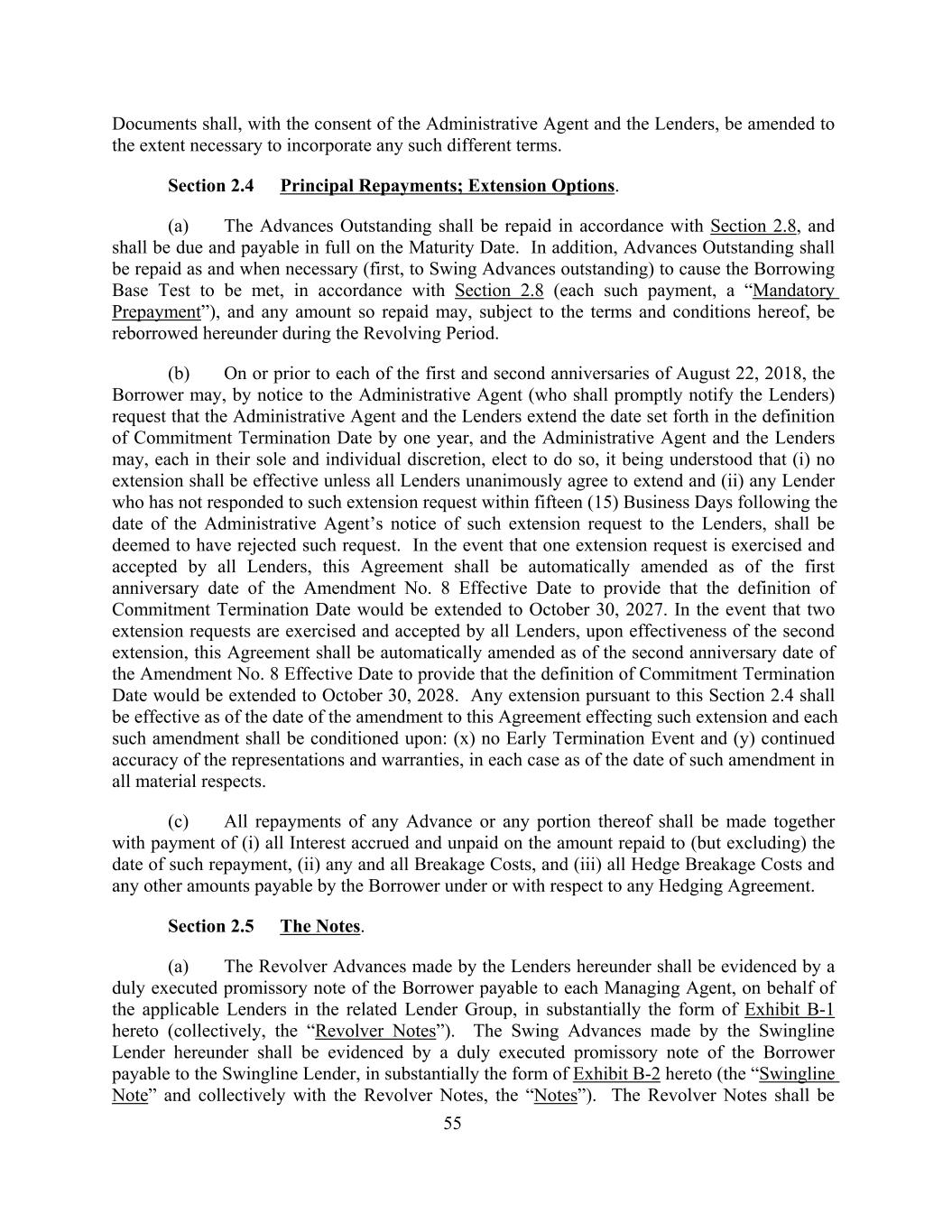 文件应在征得行政代理人和出借人同意的情况下,进行必要的修改,以纳入任何此类不同的条款。第2.4节偿还本金;延期选择。(a)未偿还的垫款应按照第2.8节偿还,并应在到期日到期并全额支付。此外,根据第2.8节,应在必要时偿还未偿还的垫款(首先是周转未偿还的垫款),以使借款基础测试得到满足(每笔此类付款,“强制性预付款”),并且根据本协议的条款和条件,如此偿还的任何金额可在循环期内根据本协议重新借出。(b)在2018年8月22日的第一个和第二个周年纪念日或之前,借款人可向行政代理人发出通知(行政代理人应及时通知贷款人),请求行政代理人和贷款人将承诺终止日期定义中规定的日期延长一年,行政代理人和贷款人可各自酌情选择这样做,据了解,(i)除非所有贷款人一致同意延期,否则任何延期均不具有效力;(ii)任何贷款人如在行政代理人向贷款人发出有关延期请求的通知之日起十五(15)个营业日内未对该延期请求作出答复,则应视为已拒绝该请求。如果一项延期请求被所有贷款人行使并接受,则自第8号修正案生效之日起一周年之日起自动修改本协议,以规定承诺终止日期的定义将延长至2027年10月30日。如果有两次延期请求被所有贷款人行使并接受,在第二次延期生效后,本协议应自第8号修正案生效日期的两周年之日起自动修订,以规定承诺终止日期的定义将延长至2028年10月30日。根据本条第2.4款作出的任何延期,均应自本协议的修订生效之日起生效,而每项此类修订均应以:(x)没有提前终止事件和(y)陈述和保证的持续准确性为条件,在每种情况下,均应自该修订之日起在所有重大方面生效。(c)任何垫款或其任何部分的所有偿还,须连同支付(i)已偿还至(但不包括)该偿还日期的款额的所有应计及未付利息,(ii)任何及所有破碎费,及(iii)所有对冲破碎费及借款人根据任何对冲协议或就任何对冲协议应付的任何其他款额。第2.5节说明。(a)贷款人根据本协议所作的循环垫款应以借款人的正式签立的本票作为证明,该本票应代表相关贷款人集团中的适用贷款人支付给每一管理代理,其形式基本上为本协议的附件 B-1(统称为“循环票据”)。Swingline贷款人根据本协议进行的周转预付款应以借款人应付给Swingline贷款人的已妥为执行的本票为凭证,本票的形式基本上为本协议的附件 B-2(“Swingline票据”,与Revolver票据合称“票据”)。左轮手枪纸币应为55