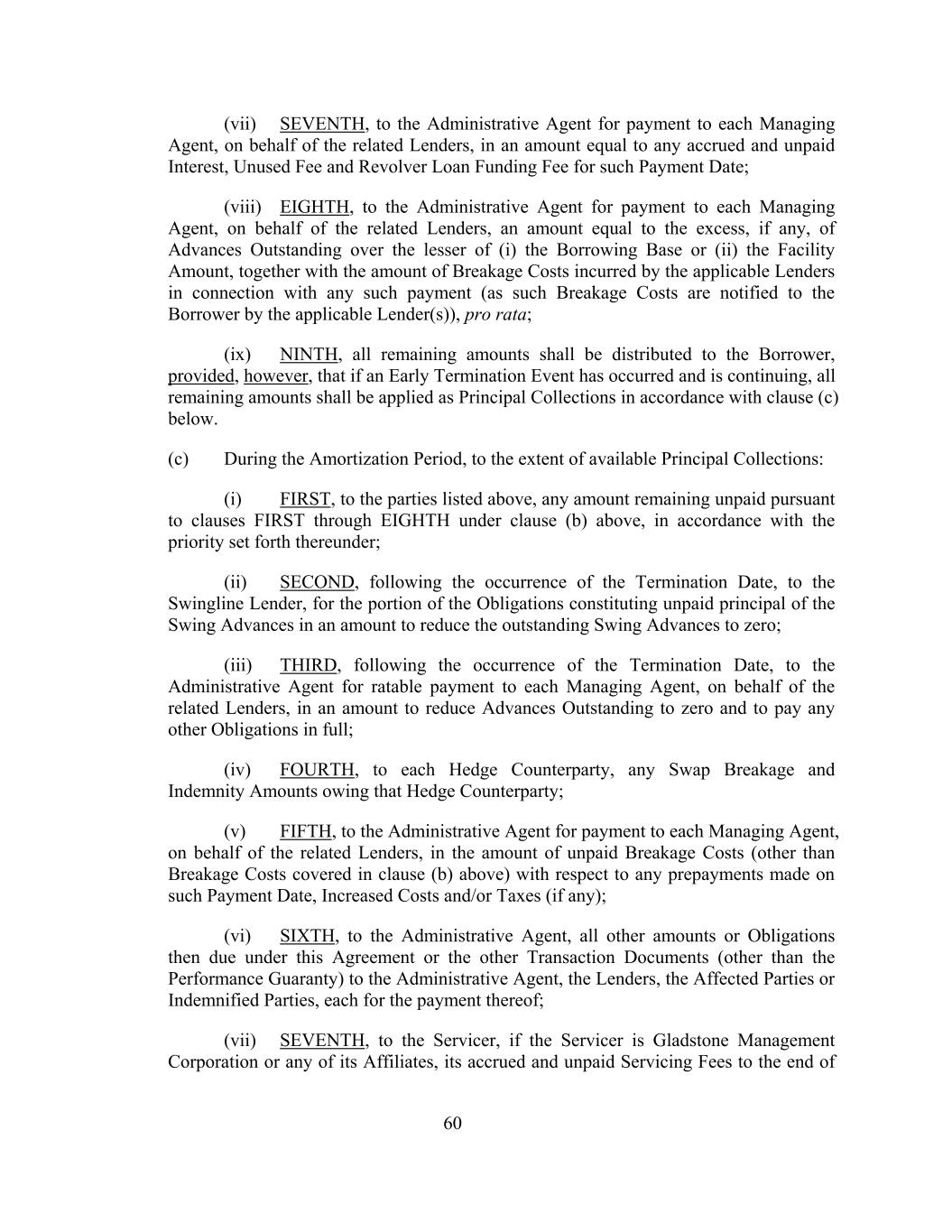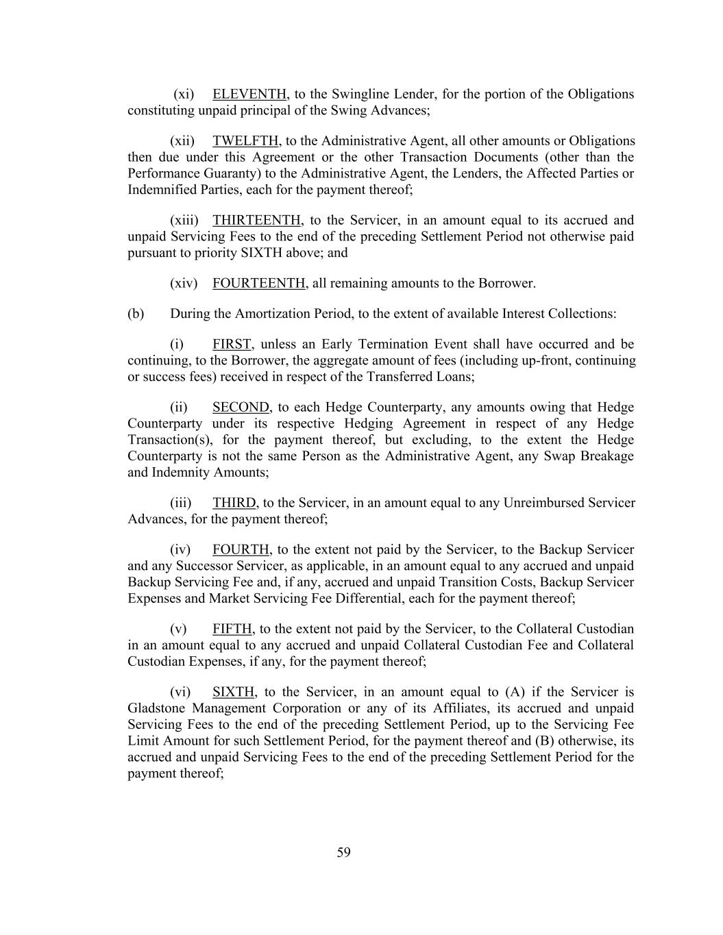 (xi)第十一次向Swingline贷款人支付构成周转预付款未付本金的部分债务;(xii)第十二次向行政代理人支付根据本协议或其他交易文件(履约保函除外)当时到期的所有其他款项或债务,向行政代理人、贷款人、受影响各方或受赔方各自支付;(xiii)第十三次向服务商支付相当于其截至前一结算期结束时未按上述优先顺序第六项支付的应计未付服务费的金额;(xiv)第十四次,所有剩余金额给借款人。(b)在摊销期内,在可收取利息的范围内:(i)首先,除非已发生并正在继续发生提前终止事件,否则就转让的贷款向借款人收取的费用总额(包括前期、持续或成功费用);(ii)第二,向每一对冲交易对手支付根据其各自的对冲协议就任何对冲交易所欠该对冲交易对手的任何款项,以支付该款项,但在对冲交易对手与行政代理人不是同一人的情况下,不包括任何掉期违约和赔偿金额;(iii)第三,向服务商支付,金额相当于任何未偿还的服务商垫款,以供支付;(iv)在服务商未支付的范围内,向备用服务商和任何继任服务商(如适用)支付第四笔,金额相当于任何应计和未支付的备用服务费,以及(如有)应计和未支付的过渡成本、备用服务商费用和市场服务费差额,每笔均用于支付;(v)在服务商未支付的范围内,向抵押托管人支付第五笔,金额相当于任何应计和未支付的抵押托管费和抵押托管费用,如有,则为支付;(vi)SIXTH,支付给服务商,金额等于(a)如果服务商是Gladstone Management Corporation或其任何关联公司,其截至上一个结算期结束时的应计未付服务费,不超过该结算期的服务费限额金额,用于支付;(b)否则,其截至上一个结算期结束时的应计未付服务费用于支付;5 9