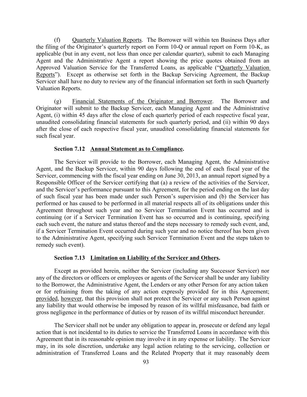 (f)季度估值报告。借款人将在发起人提交表格10-Q的季度报告或表格10-K的年度报告(如适用)后的十个营业日内(但无论如何,每个日历季度不少于一次),向各管理代理人和行政代理人提交一份报告,其中显示从经批准的估值服务获得的转让贷款报价(如适用)(“季度估值报告”)。除备份服务协议另有规定外,备份服务商没有责任审查该等季度估值报告所载的任何财务信息。(g)发起人和借款人的财务报表。借款人和发起人将向备用服务商、每个管理代理和行政代理提交(i)在每个相应财政年度的每个季度期间结束后的45天内,该季度期间的未经审计的合并财务报表,以及(ii)在每个相应财政年度结束后的90天内,该财政年度的未经审计的合并财务报表。第7.12节关于合规的年度声明。服务商将在自2013年6月30日结束的财政年度开始的服务商每个财政年度结束后的90天内,向借款人、每个管理代理、行政代理和备用服务商提供一份由服务商负责官员签署的年度报告,证明(a)对服务商的活动进行审查,以及服务商根据本协议的履行情况,对于截至该财政年度最后一天的期间,已在该人的监督下作出,且(b)该服务商在该年度内已履行或已促使在所有重大方面履行其在本协议下的所有义务,且未发生且仍在继续的服务商终止事件(或如果服务商终止事件已发生且仍在继续,具体说明每一此类事件、其性质和状态以及补救该事件所需的步骤,以及,如果在该年度内发生了服务器终止事件,但未向行政代理人发出通知,具体说明该服务器终止事件以及为补救该事件而采取的步骤)。第7.13节服务人及其他人的责任限制。除本协议另有规定外,服务人(包括任何继任服务人)或服务人的任何董事或高级人员或雇员或代理人,均不得就所采取的任何行动或因不采取本协议明文规定的任何行动而对借款人、行政代理人、贷款人或任何其他人承担任何法律责任;但条件是,本条款不应保护服务人或任何该等人免受因其故意不当行为而会被施加的任何法律责任,在履行职责时的恶意或重大疏忽或因其在本协议项下的故意不当行为。服务人没有任何义务出庭、起诉或抗辩其根据本协议为所转让贷款提供服务的职责所不附带的任何法律诉讼,而其合理地认为该诉讼可能涉及其任何费用或责任。服务商可全权酌情采取其合理认为与所转让贷款及相关财产的服务、收取或管理有关的任何法律行动93