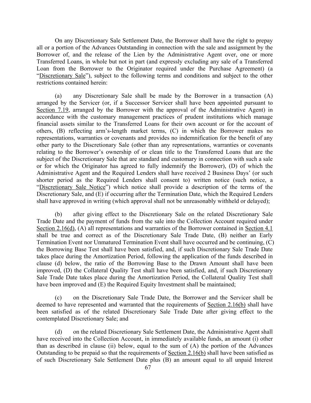 在任何全权出售结算日,借款人有权提前全部或部分预付与借款人出售和转让一笔或多笔转让贷款有关的未偿还垫款,以及行政代理人解除对一笔或多笔转让贷款的留置权,但不得部分预付(并明确排除根据购买协议要求将借款人转让的贷款出售给发起人)(“全权出售”),受以下条款和条件的约束,并受本协议所载的其他限制:(a)任何酌情出售应由借款人在服务商安排的交易(a)中(或者,如果继任服务商已根据第7.19条指定,则由借款人在行政代理人批准的情况下安排)按照审慎机构的习惯管理惯例进行,这些机构为自己的账户或为他人的账户管理类似于所转让贷款的金融资产,(b)反映公平的市场条款,(c)借款人不作任何陈述,保证或契诺,且不为酌情出售的任何其他方的利益提供任何赔偿(但与借款人对作为酌情出售标的的转让贷款的所有权或清洁所有权有关的任何陈述、保证或契诺除外,这些陈述、保证或契诺是与此类出售有关的标准和惯例,或发起人已同意为此向借款人提供全额赔偿),(d)其中行政代理人及规定贷款人须已收到2个营业日的书面通知(或规定贷款人同意的较短期限)(该通知、“酌情出售通知”),而该通知须提供有关酌情出售条款的说明,及(e)如发生在终止日期后,规定贷款人应已书面批准(该批准不得无理扣留或延迟);(b)在有关的酌情出售交易日期生效及根据第2.16(d)条规定将出售所得款项支付至收款账户后,(a)第4.1节所载的借款人的所有陈述和保证自该酌情出售交易日期起均属真实和正确,(b)提前终止事件或未到期终止事件均不应发生且仍在继续,(c)借款基础测试应已满足,并且,如果该全权出售交易日发生在摊销期内,则在应用下文第(d)款所述资金后,借款基数与提取金额的比率应已得到改善,(d)抵押品质量测试应已满足,如果该全权出售交易日发生在摊销期内,则抵押品质量测试应已得到改善,并且(e)应保持所需的股权投资;(c)在全权出售交易日,借款人和服务人应被视为已声明并保证,在预期的全权出售生效后,截至相关的全权出售交易日期,第2.16(b)条的要求已得到满足;及(d)在相关的全权出售结算日,行政代理人应已以即时可用资金向收款账户收取下文第(ii)款所述以外的金额(i),等于(a)待预付的未付垫款部分的总和,以使第2.16(b)条的规定在该酌情出售结算日已获满足加上(b)等于所有未付利息的金额67