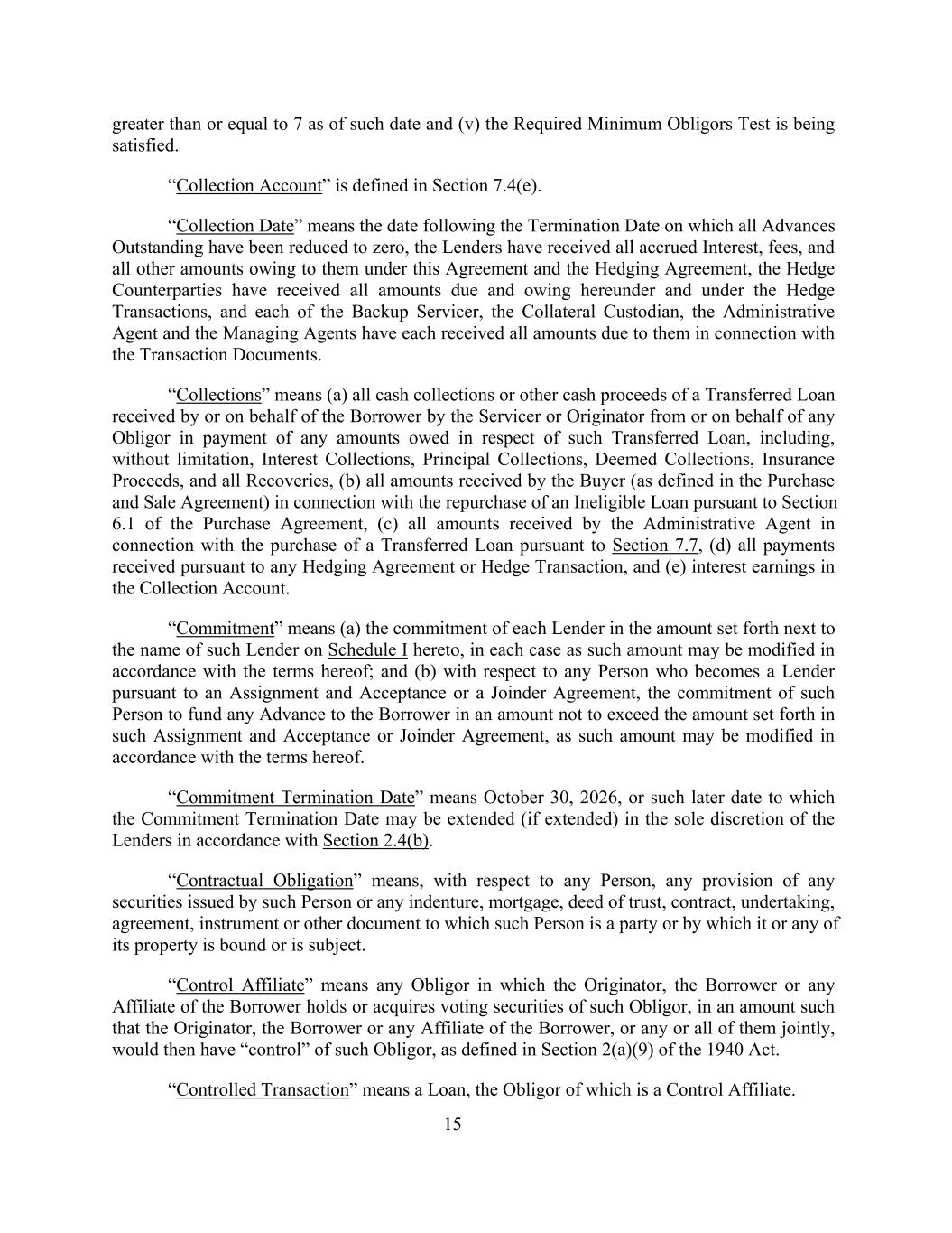 截至该日期大于或等于7,且(v)正在满足规定的最低义务人测试。“收款账户”在第7.4(e)节中定义。「收款日」指终止日期的翌日,所有未偿还的垫款已减至零,贷款人已收到所有应计利息、费用,以及根据本协议及对冲协议欠他们的所有其他款项,对冲交易对手已收到根据本协议及对冲交易项下的所有到期及欠款,而后备服务商、抵押品托管人、行政代理人及管理代理人各自已收到与交易文件有关的所有应付他们的款项。“收款”是指(a)服务人或发起人从或代表任何债务人收到的转让贷款的所有现金收款或其他现金收益,用于支付与该转让贷款有关的任何欠款,包括但不限于利息收款、本金收款、视同收款、保险收益和所有追偿,(b)买方收到的与根据购买协议第6.1节回购不合格贷款有关的所有款项(定义见买卖协议),(c)行政代理人根据第7.7条就购买转让贷款而收到的所有款项,(d)根据任何对冲协议或对冲交易收到的所有付款,以及(e)收款账户中的利息收益。“承诺”是指(a)每个贷款人对本协议附表I该贷款人名称旁边所列金额的承诺,在每种情况下,该金额可能会根据本协议的条款进行修改;(b)就根据转让和接受或共同协议成为贷款人的任何人而言,该人承诺为向借款人提供的任何预付款提供资金,金额不超过该转让和接受或共同协议中规定的金额,因为这样的金额可能会根据本协议的条款进行修改。“承诺终止日期”是指2026年10月30日,或贷款人可根据第2.4(b)节全权酌情决定将承诺终止日期延长(如延长)的较晚日期。“合同义务”就任何人而言是指该人所发行的任何证券的任何条款或该人作为一方当事人或其或其任何财产受其约束或受其约束的任何契约、抵押、信托契据、合同、承诺、协议、文书或其他文件。“控制附属公司”是指发起人、借款人或借款人的任何附属公司持有或获得该债务人的有表决权证券的任何债务人,其数额使发起人、借款人或借款人的任何附属公司,或其中任何一方或所有人共同拥有对该债务人的“控制权”,如1940年法案第2(a)(9)节所定义。“受控交易”是指贷款,其义务人是控制关联公司。15
