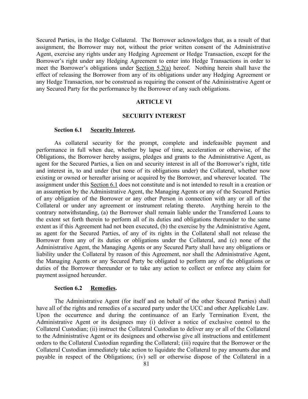 有担保方,在对冲质押物中。借款人承认,由于该转让,未经行政代理人事先书面同意,借款人不得行使任何套期保值协议或套期保值交易项下的任何权利,但借款人根据任何套期保值协议为履行借款人根据本协议第5.2(a)节承担的义务而订立套期保值交易的权利除外。本文中的任何内容均不具有解除借款人在任何套期保值协议或任何对冲交易项下的任何义务的效力,也不被解释为要求行政代理人或任何担保方同意借款人履行任何此类义务。第六条担保权益第6.1节担保权益。作为及时、完整和不可撤销的付款和到期全额履行债务的抵押担保,无论是通过时间的推移、加速还是其他方式,借款人特此将借款人在担保物上的所有权利、所有权和权益(无论是现在存在的还是由借款人拥有的或此后产生或获得的)上的留置权、所有权和权益(但不包括其在担保物下的任何义务)上的留置权和担保权益转让、质押和授予行政代理人,以及位于何处。根据本条第6.1款进行的转让不构成也不打算导致行政代理人、管理代理人或任何有担保当事人设定或承担借款人或任何其他人与任何或所有担保物有关的任何义务或根据与此有关的任何协议或文书承担的义务。尽管本文中有任何相反的情况,(a)借款人仍应在转让贷款项下承担责任,以履行其在转让贷款项下的所有职责和义务,其程度与未执行本协议的程度相同,(b)行政代理人作为有担保方的代理人行使其在担保物上的任何权利不应解除借款人在担保物项下的任何职责或义务,以及(c)该行政代理人均不得解除其在担保物项下的任何职责或义务,管理代理人或任何有担保方因本协议而在担保物项下承担任何义务或责任,行政代理人、管理代理人或任何有担保方也无义务履行借款人在本协议项下的任何义务或义务,或采取任何行动收取或强制执行根据本协议转让的任何付款索赔。第6.2节补救办法。行政代理人(为其本人和代表其他有担保方)享有有担保方在UCC和其他适用法律下的所有权利和救济。在提前终止事件发生时和持续期间,行政代理人或其指定人可(i)向抵押品托管人交付专属控制权通知;(ii)指示抵押品托管人将任何或全部抵押品交付给行政代理人或其指定人,并以其他方式向抵押品托管人发出关于抵押品的所有指示和权利命令;(iii)要求借款人或抵押品托管人立即采取行动清算抵押品,以支付与债务相关的到期应付款项;(iv)出售或以其他方式处置抵押品在81