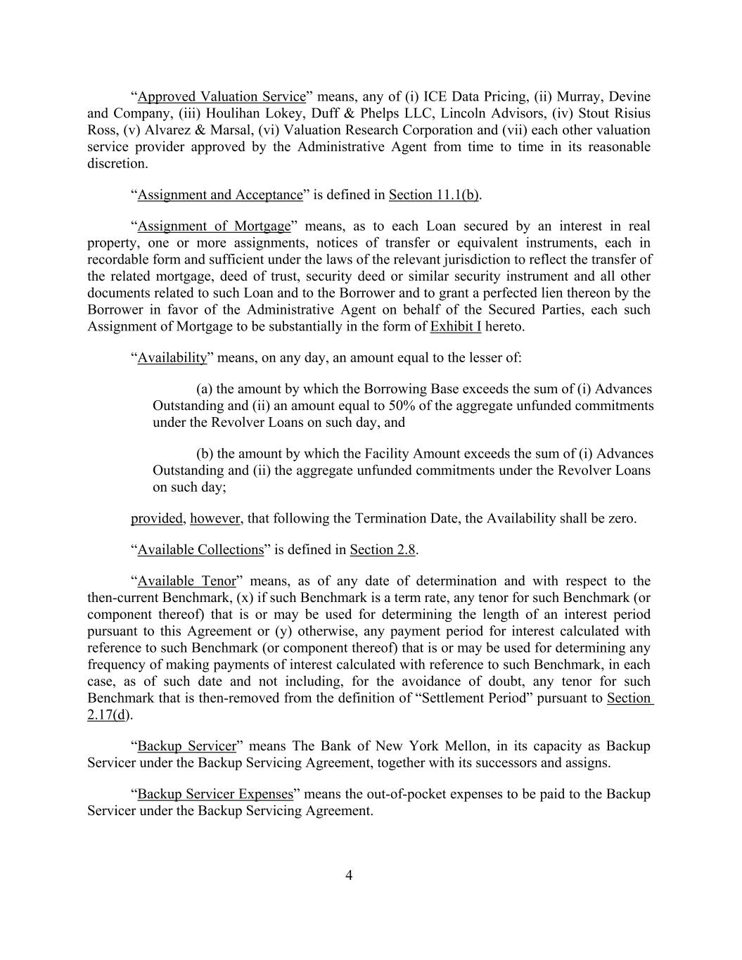 “经批准的估值服务”指(i)ICE数据定价,(ii)Murray、Devine and Company,(iii)华利安、达夫菲尔普斯 LLC、Lincoln Advisors,(iv)Stout Risius Ross,(v)Alvarez & Marsal,(vi)Valuation Research Corporation及(vii)互为行政代理人不时以合理酌情权批准的估值服务供应商。第11.1(b)节对“转让和接受”进行了定义。“转让抵押”是指,就以不动产权益为担保的每笔贷款、一项或多项转让、转让通知或同等文书,每一项均为可记录形式,且根据相关司法管辖区的法律足以反映相关抵押、信托契据、担保契据或类似担保文书以及与该贷款有关的所有其他文件的转让情况,并由借款人代表有担保方授予有利于行政代理人的完善的留置权,每项此类抵押转让基本上都以本协议所述的附件形式存在。“可用性”是指在任何一天,等于以下两者中较小者的金额:(a)借款基数超过(i)未偿预付款和(ii)相当于该日循环贷款下未提供资金的承付款总额的50%的金额,以及(b)融资金额超过(i)未偿预付款和(ii)该日循环贷款下未提供资金的承付款总额的金额;但条件是,在终止日期之后,可用性应为零。“可用藏品”在第2.8节中有定义。“可用期限”是指,截至任何确定日期,就当时的基准而言,(x)如果该基准为定期利率,则该基准(或其组成部分)的任何期限,即目前或可能用于根据本协议确定利息期长度,或(y)其他情况下,参照该基准(或其组成部分)计算的利息的任何支付期限,目前或可能用于确定参照该基准计算的利息支付的任何频率,在每种情况下,截至该日期,不包括,为免生疑问,随后根据第2.17(d)节从“结算期”定义中删除的此类基准的任何期限。“备份服务商”指纽约梅隆银行,作为备份服务协议下的备份服务商,连同其继任者和受让人。“备份服务商费用”是指根据备份服务协议向备份服务商支付的自付费用。4