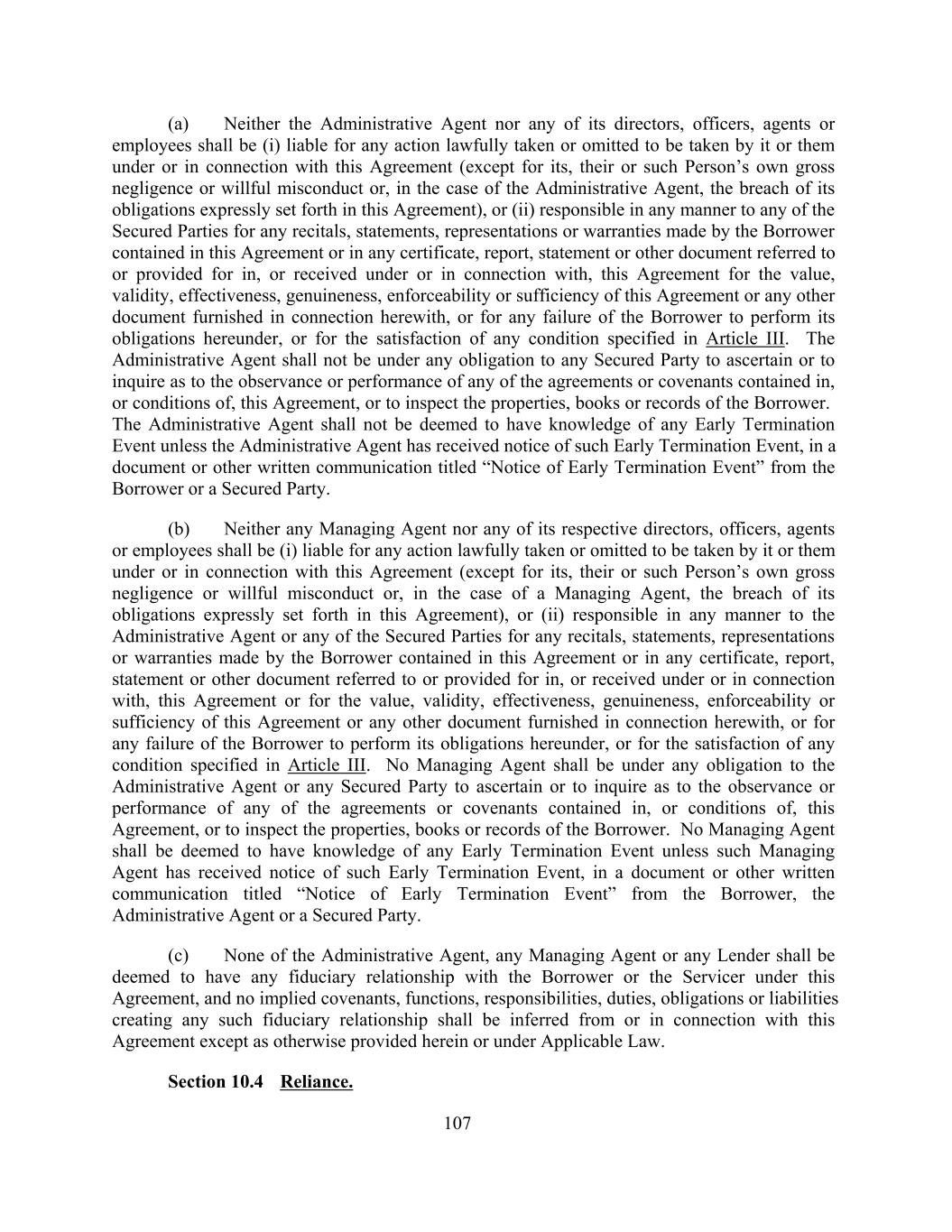 (a)行政代理人或其任何董事、高级人员、代理人或雇员均不得(i)对其根据本协议或与本协议有关而合法采取或不采取的任何行动(其、其或该人本身的重大过失或故意不当行为除外,或就行政代理人而言,违反其在本协议中明确规定的义务)承担责任,或(ii)以任何方式对任何有担保当事人承担任何陈述、陈述的责任,本协议或本协议中提及或规定的、或根据本协议收到的或与本协议有关的任何证书、报告、声明或其他文件中所载的借款人就本协议或与本协议有关的任何其他文件的价值、有效性、有效性、真实性、可执行性或充分性作出的陈述或保证,或因借款人未能履行其在本协议下的义务,或为满足第三条规定的任何条件而作出的陈述或保证。行政代理人不对任何有担保方承担任何义务,以查明或查询本协议所载的任何协议或契诺的遵守或履行情况或本协议的条件,或检查借款人的财产、簿册或记录。除非行政代理人已收到借款人或担保方以“提前终止事件通知”为标题的文件或其他书面函件,否则不应被视为知悉任何提前终止事件。(b)任何管理代理人或其各自的任何董事、高级人员、代理人或雇员均不得(i)对其或他们根据本协议或与本协议有关而合法采取或不采取的任何行动(除非其、其或该人本身的重大过失或故意不当行为,或在管理代理人的情况下,违反其在本协议中明确规定的义务)承担责任,或(ii)以任何方式对行政代理人或任何有担保当事人承担任何陈述、陈述的责任,借款人在本协议或本协议中提及或规定的任何证书、报告、声明或其他文件中作出的陈述或保证,或根据本协议或与本协议有关的任何其他文件或就本协议或与本协议有关的任何其他文件的价值、有效性、有效性、真实性、可执行性或充分性作出的陈述或保证,或就借款人未能履行其在本协议下的义务作出的陈述或保证,或就满足第三条规定的任何条件作出的陈述或保证。管理代理人不得对行政代理人或任何有担保方承担任何义务,以查明或查询本协议所载任何协议或契诺的遵守或履行情况或本协议的条件,或检查借款人的财产、簿册或记录。任何管理代理人不得被视为知悉任何提前终止事件,除非该管理代理人已收到借款人、行政代理人或担保方以“提前终止事件通知”为标题的文件或其他书面通信。(c)行政代理人、任何管理代理人或任何贷款人均不得被视为与本协议项下的借款人或服务人有任何信托关系,除本协议或适用法律另有规定外,不得从本协议中推断或与本协议相关推断产生任何此类信托关系的任何默示契诺、职能、责任、义务、义务或责任。第10.4节依赖。107